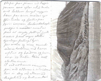 - við voknum snemma því við ætlum í utreiðartur í dag við ætlum að máfahlíð og teikna þar við fáum 2 hesta lanaða og ríðum svo á stað kl 10 við höldum inn vegin hjá Fróðá þar er nu litið að sjá af hinu stóra setri aðeins nokkrar rustir við höldum áfram inn sveitina þar til við komum að Kötluholti þar er sögustaður úr Eirbiggju þar birjum við straks að mála þar er ljómandi fallegt máfahlíðin til austurs og háir hnukar og dalir til suðurs og vesturs eg mála þar tvær mindir okkur er boðið kaffi við drekkum það og borðum volgar pönnukökur fólkið er mjög vingjarnlegt við erum þar til kl 7 þá forum við á stað heimleiðis forum framm með mjog fallegu stuðlabergi við komum ekki heim fyrr en kl 10 þá borðum við og forum að sofa en ég er að lesa til kl 12 Góða nótt elsku vinir. á morgun ætlum við 7 tíma sjóferð frá Ólafsv. og til Bjarnarhafnar.
