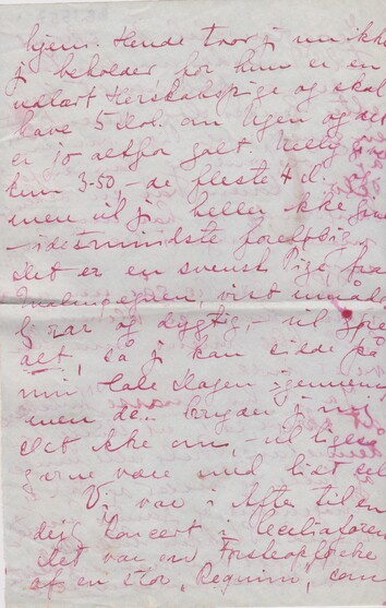 Tænk, jeg har idag fået en Pige – og det er henrivende – sikken et Himmerig det er de første Dage, ikke at behøve at skruppe, - få sin Mad sat på Bordet for sig og se Køkkenet skinnende rent. – Det er ligesom man bliver et helt andet Menneske ved det. Jeg strittede derimod af al Magt, for jeg mente ikke vi havde Raad lidt endnu, - og det har vi heller ikke, men Harris blev ved, at jeg skulde have èn, og igår hittede han én på et Fæstekontor og sendte hjem. Hende tror jeg nu ikke jeg beholder, for hun er en udlært Herskabspige og skal have 5 Dol. om Ugen og det er jo altfor galt. Nelly giver kun 3-50, - de fleste 4 D. og mere vil jeg heller ikke give – i det mindste foreløbig. Det er en svensk Pige, fra Malmøegnen, vist umådelig rar og dygtig, - vil gøre alt, så jeg kan sidde på min Hale Dagen igennem, men det bryder jeg mig slet ikke om, - vil ligeså gærne være med lidt selv.
