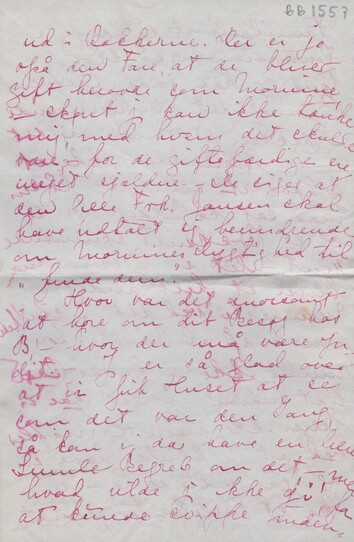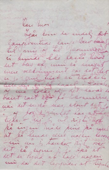 Igår kom da endelig dit længeventede Brev baade til mig og til Mornine. Ja, vi kunde ikke forstå, hvor det blev af, men så meget mere velkomment var det. Det er jo grulig trist at stakkels Dis er så dårlig i Hovedet og må holde op – det havde da været rart af at få Eksamenen, når det er så nær, skønt det i og for sig intet har at betyde. – Nej, jeg vil rigtignok på ingen Måde pine på, med at få hende eller nogen herover – nu når jeg tænker rigtig over det, så synes jeg jo også at det er synd at tage nogen nu, da det begynder at tynde ud i Rækkerne. Der er jo også den Fare, at de bliver gift herovre som Mornine, – skønt jeg kan ikke tænke mig, med hvem det skulde være, - for de giftefærdige ere meget sjældne. De siger at den lille Frk. Jansen skal have udtalt sig beundrende om Mornines Dygtighed til ”finde dem”.