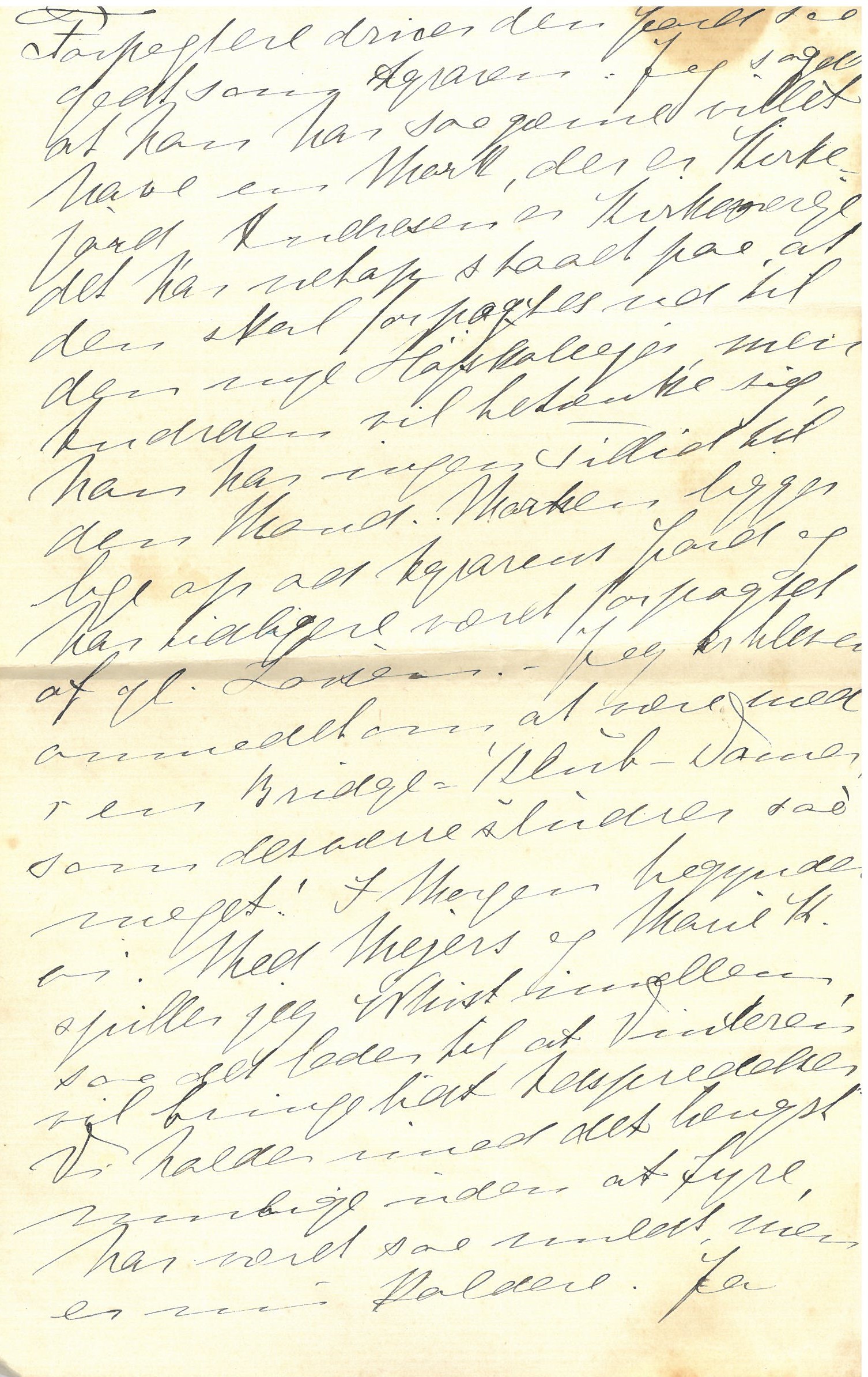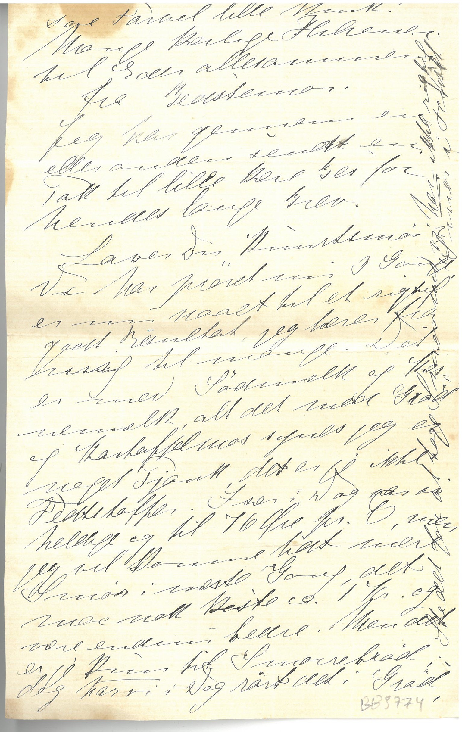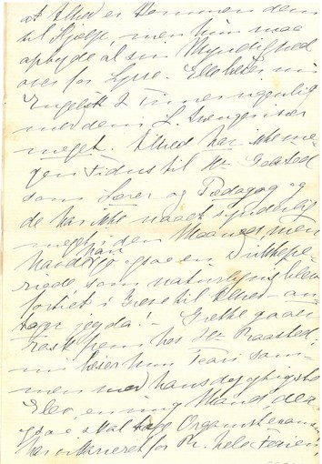 Laver Du Kunstsmør? Vi har prøvet nu 3 Gange, er nu naaet til et rigtig godt Resultat, jeg lærer fra mig til mange. Det er med Sødmælk og Kernemælk, alt det med Grød og Kartoffelmos synes jeg er noget Pjank, det er jo ikke Fedtstoffer. Især i Dag var vi heldige og til 76 Øre pr. Pund, men jeg vil komme lidt mere Smør i næste Gang, det maa nok koste ca. 1 Kr. og være endnu bedre. Men det er jo kun til Smørrebrød; dog har vi i Dag rørt det i Grød, [teksten fortsætter langs højre margen; lodret:] i Stedet for at koge Smør med, vi har ikke rigtig Smør i Huset.