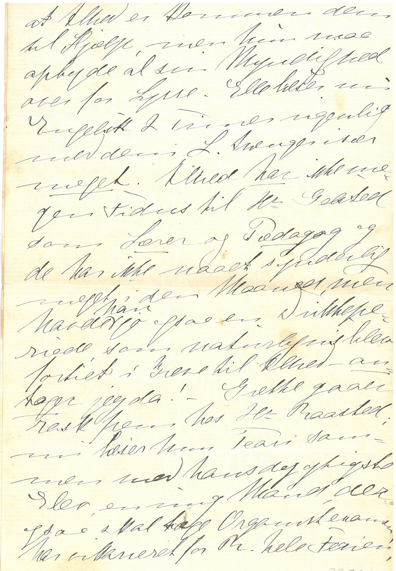Til Lykke med de smaa Ungers Fødselsdag paa Søndag; jeg sender disse "imponerende Gaver!!! - i god Tid. De skal vel have Gæster, god Fornøjelse og godt Vejr dertil! Alhed var her til Kaffe i Gaar, morsomt at høre noget om hendes Oplevelser. Hun har jo da haft godt Udbytte af den gode "Ferie." Kunde ogsaa behøves til den store Virksomhed, hun nu har begyndt med Drengene. De har ikke rigtig kunnet tumle Lysse alene; Puf mener, at det har allerede hjulpen og han mærker at Alhed er kommen dem til Hjælp, men hun maa opbyde al sin Myndighed over for Lysse. Elle læser nu Engelsk 2 Timer ugentlig med dem. L trænger især meget. Alhed har ikke megen Fidus til Hr Gelsted som Lærer og Pædagog og de har ikke naaet synderlig meget i den Maaned, men havde han ["han" indsat over linjen] jo ogsaa en Drikkeperiode, som naturligvis blev fortiet i Breve til Alhed - antager jeg da! - Grethe gaaer rask frem hos Hr. Raasted; nu læser hun Teori sammen med hans dygtigste Elev, en ung Mand, der ogsaa skal tage Organistexamen, har vikarieret for Rr. hele Ferien, er altsaa ualmindelig flink, men Grethe er dog N_o_ 1 hver Gang, er det ikke morsomt, der er rigtig Kappestrid mellem dem. De skulde forrige Gang sætte Accompagnement til en ukendt Salmemelodi, og Grethe var den bedste den var harmonisk og køn. Elle spiste til Aften hos Raasteds forleden og han roste Grethes Præstationer meget. - Vi har haft den store Glæde, at Ville Fibiger har faaet sin Pension forhøjet med 300 Kr. samt 100 Kr. om Aaret, saa længe Dyrtiden varer, og et meget elskværdigt Brev fra Greven. Samtidig fik hun Guldbryllupslegatet 200 Kr. aarlig; saa hun nu ["hun" overstreget; "nu" indsat over linjen] har hun 1140 Kr. - mod 540 før! Hun er lykkelig, jeg fik Brev fra hende derom. Nu vil hun betale 60 Kr. mdl. hos Søstrene, de fik tidligere hele hendes Indtægt. - Nu gaaer det godt frem med Johanne; i Formiddags var jeg deroppe og hun gik og fejede i den pæne Stue; hun taaler nu lidt husligt Arbejde. Jeg spiste til Aften der baade til Agrarens og hendes Fødselsdag. Chokoladegæster bagefter. Elle og jeg var i Aftes til en uhyre fin Aftenkaffe hos gl. Andresens; Mennesker var der, som vi aldrig før har været sammen med. Dr. Schwarts's, Borgmesterens, og de to rare Frøken Munk og Breum, meget fornøjelige Mennesker at snakke en Aften med et nydeligt Hus. Jeg fortalte Andresen, at Agraren har avlet saa udmærket i Aar og han sagde, at den Gaard bliver ogsaa passet brillant, aldrig Ukrudt i Kornet, ingen Makiner eller Redskaber ligger ude at flyde som hos Naboen; ingen af Byens Forpagtere driver den Gaard saa godt som Agraren. Jeg sagde, at han har saa gærne villet have en Mark, der er Kirkejord, Andresen er Kirkeværge; det har netop staaet paa, at den skal forpagtes ud til den nye Højskoleejer, men Andresen vil betænke sig, han har ingen Tillid til den Mand. Marken ligger lige op ad Agrarens Jord og har tidligere været forpagtet af gl. Larsen. - Jeg er bleven anmodet om at være med i en Bridge-Klub-Damer, som desværre sludrer saa meget! I Morgen begynder vi. Med Meyers og Marie K. spiller jeg Whist imellem, saa det lader til, at Vinteren vil blive bringe lidt Adspredelser. Vi holder imod det længst mulige at fyre, har været saa mildt, men er nu koldere. Ja saa Farvel ille Muk!