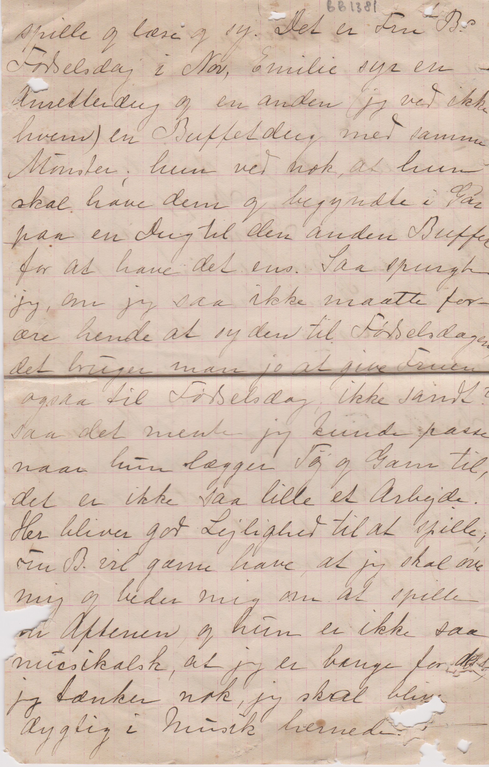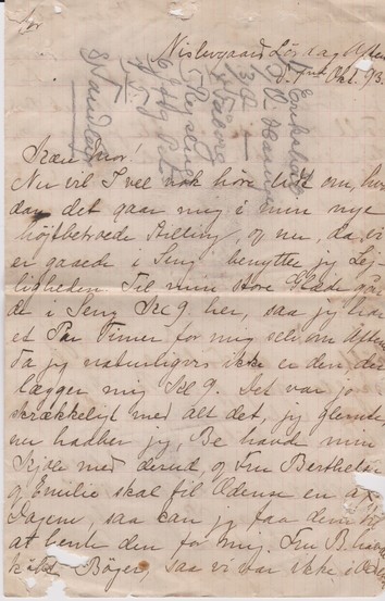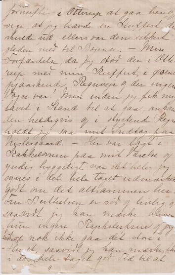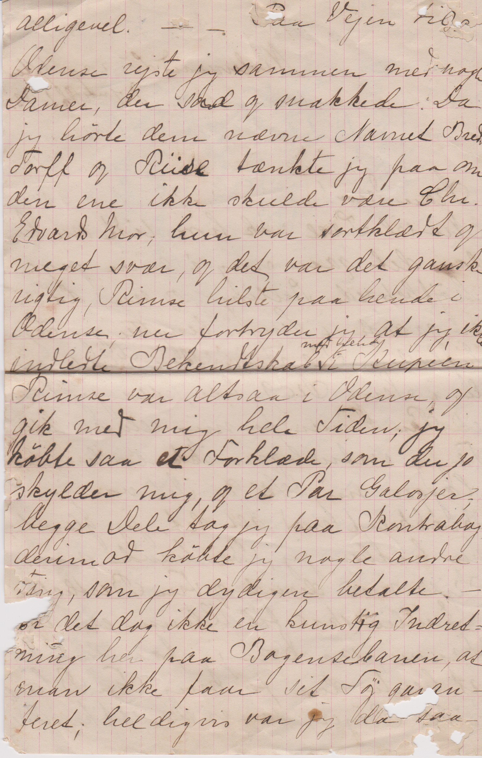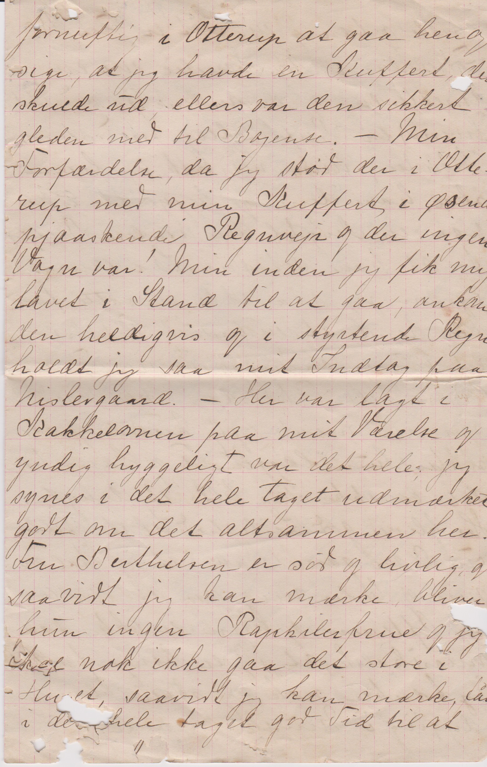 Nu vil I vel nok høre lidt om, hvordan det gaar mig i min nye højtbetroede Stilling, og nu, da vi er gaaede i Seng benytter jeg Lejligheden. Til min store Glæde går de i Seng Kl 9 her, saa jeg har et Par Timer for mig selv om Aftenen, da jeg naturligvis ikke er den, der lægger mig Kl 9. Det var jo skrækkeligt med alt det, jeg glemte, nu haaber jeg, Be havde min Kjole med derud, og Fru Berthelsen og Emilie skal til Odense en af Dagene, saa kan jeg faa dem til at hente den for mig. Fru B. havde købt Bøger, saa vi var ikke i Odense alligevel. - - Paa Vejen til Odense rejste jeg sammen med nogle Damer, der sad og snakkede. Da jeg hørte dem nævne Navnet Bredsdorff og Riise tænkte jeg paa om den ene ikke skulde være Chr. Edvards Mor, hun var sortklædt og meget svær, og det var det ganske rigtigt. Rimse hilste paa hende i Odense; nu fortryder jeg, at jeg ikke indledte Bekendtskabet med hende [”med hende” indsat over linien] i Kupeen. Rimse var altsaa i Odense og gik med mig hele Tiden; jeg købte saa et Forklæde, som du jo skylder mig, og et Par Galosjer; begge Dele tog jeg paa Kontrabog, derimod købte jeg nogle andre Ting, som jeg dydigen betalte. – Er det dog ikke en kunstig Indretning her paa Bogensebanen, at man ikke faar sit Tøj garanteret; heldigvis var jeg da saa fornuftig i Otterup at gå hen og sige, at jeg havde en Kuffert, der skulde ud; ellers var den sikkert gleden med til Bogense. – Min Forfærdelse, da jeg stod der i Otterup med min Kuffert i øsende, pjaskende Regnvejr og der ingen Vogn var! Men inden jeg fik mig lavet i Stand til at gaa, ankom den heldigvis og i styrtende Ragn, holdt jeg saa mit Indtog paa Nislevgaard. – Her var lagt i Kakkelovnen paa mit Værelse og yndig hyggeligt var det hele; jeg synes i det hele taget udmærket godt om det alt sammen her. Fru Berthelsen er sød og livlig, og saavidt jeg kan mærke, bliver hun ingen Rapkilerfrue og jeg skal nok ikke gaa det store i Huset, saavidt jeg kan mærke, får i det hele taget god Tid til at spille og læse og sy. Det er Fru Bs Fødselsdag i Nov, Emilie syr en Anretterdug og en anden (jeg ved ikke hvem) en Buffetdug med samme Mønster; hun ved nok, at hun skal have dem og begyndte i Går paa en Dug til den anden Buffet for at have det ens: Saa spurgte jeg, om jeg saa ikke maatte forære hende at sy den til Fødselsdagen, det bruger man jo at give Fruen ogsaa til Fødselsdag, ikke sandt? Saa det mente jeg kunde passe naar hun lægger Tøj og Garn til, det er ikke saa lille et Arbejde. Her bliver god Lejlighed til at spille; Fru B. vil gerne have, at jeg skal øve mig og beder mig om at spille om Aftenen og hun er ikke saa musikalsk, at jeg er bange for det, jeg tænker nok, jeg skal blive dygtig til Musik hernede. –