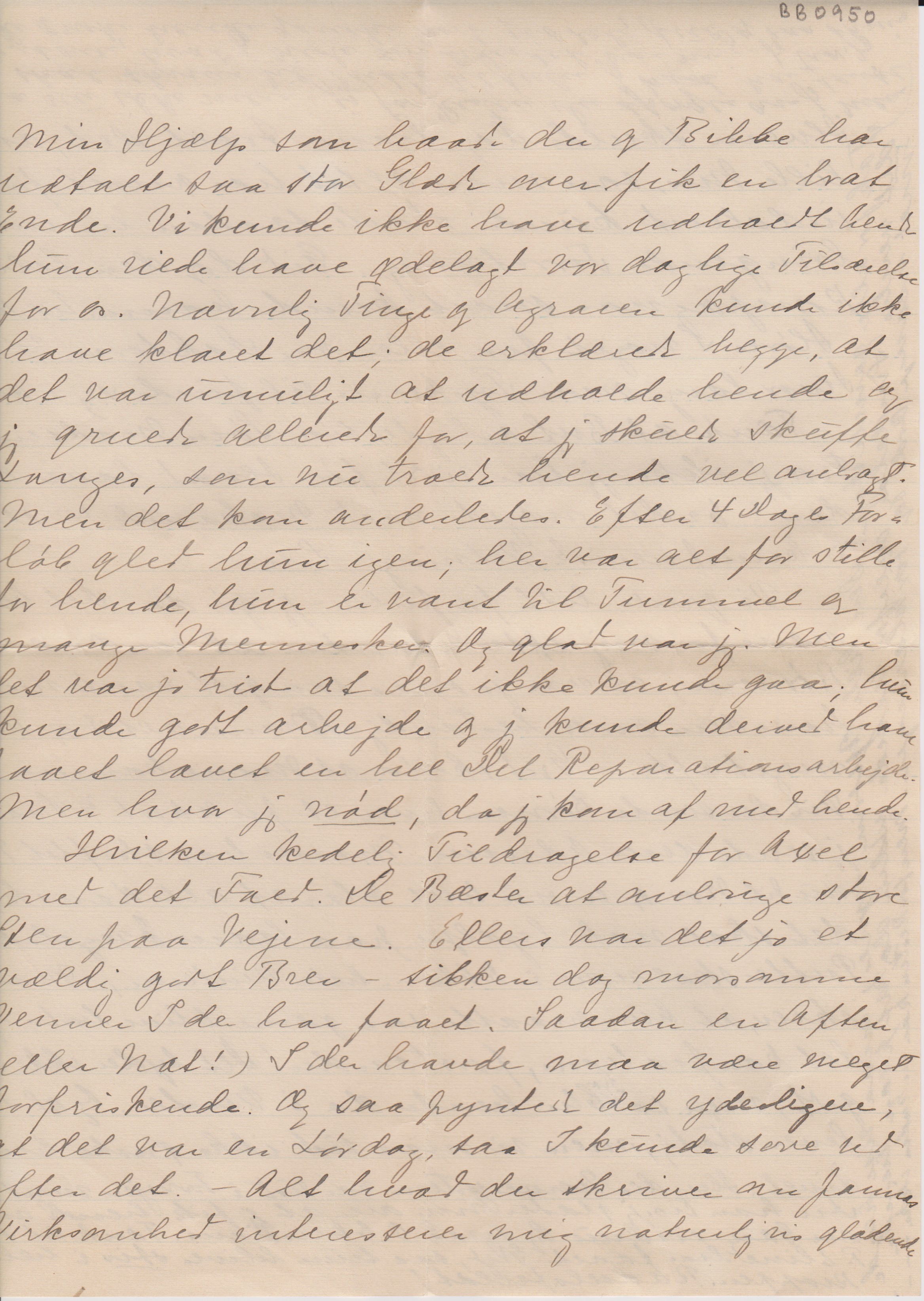 Min Hjælp som baade du og Bibbe har udtalt saa stor Glæde over fik en brat Ende. Vi kunde ikke have udholdt hende hun vilde have ødelagt vor daglige Tilværelse for os. Navnlig Tinge og Agraren kunde ikke have klaret det; de erklærede begge, at det var umuligt at udholde hende, og jeg gruede allermest for, at jeg skulde skuffe Langes, som nu troede hende vel anbragt. Men det kom anderledes. Efter 4 Dages Forløb gled hun igen; her var alt for stille for hende, hun er vant til Tummel og mange Mennesker. Og glad var jeg. Men det var jo trist at det ikke kunde gaa; hun kunde godt arbejde og jeg kunde derved have faaet lavet en hel Del Reparationsarbejde. Men hvor jeg nød, da jeg kom af med hende.