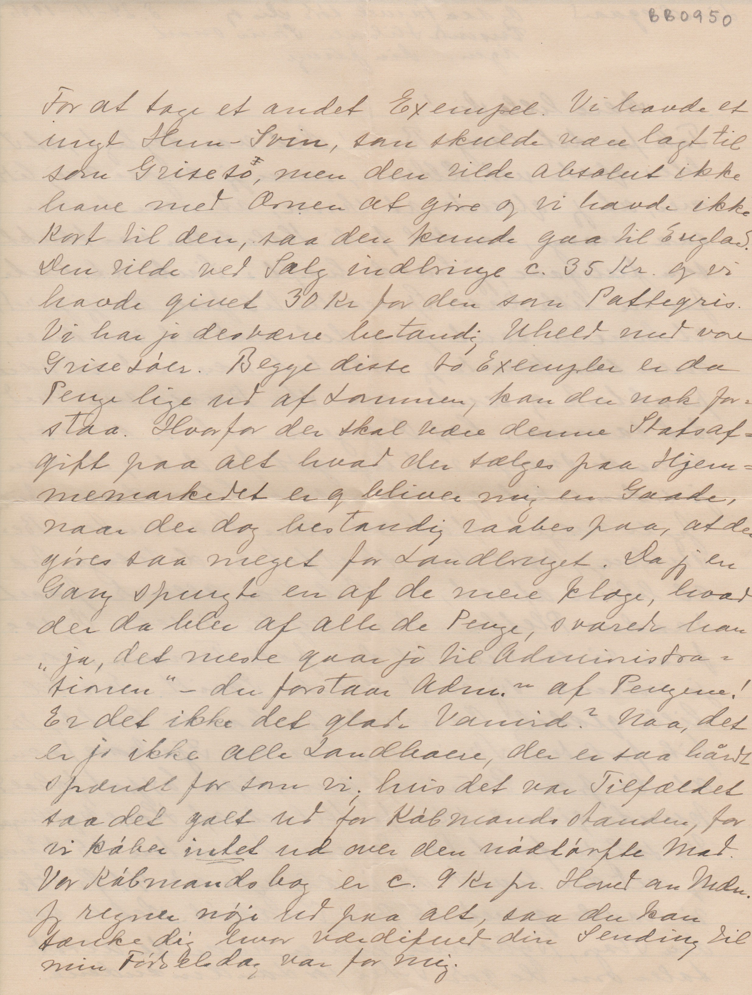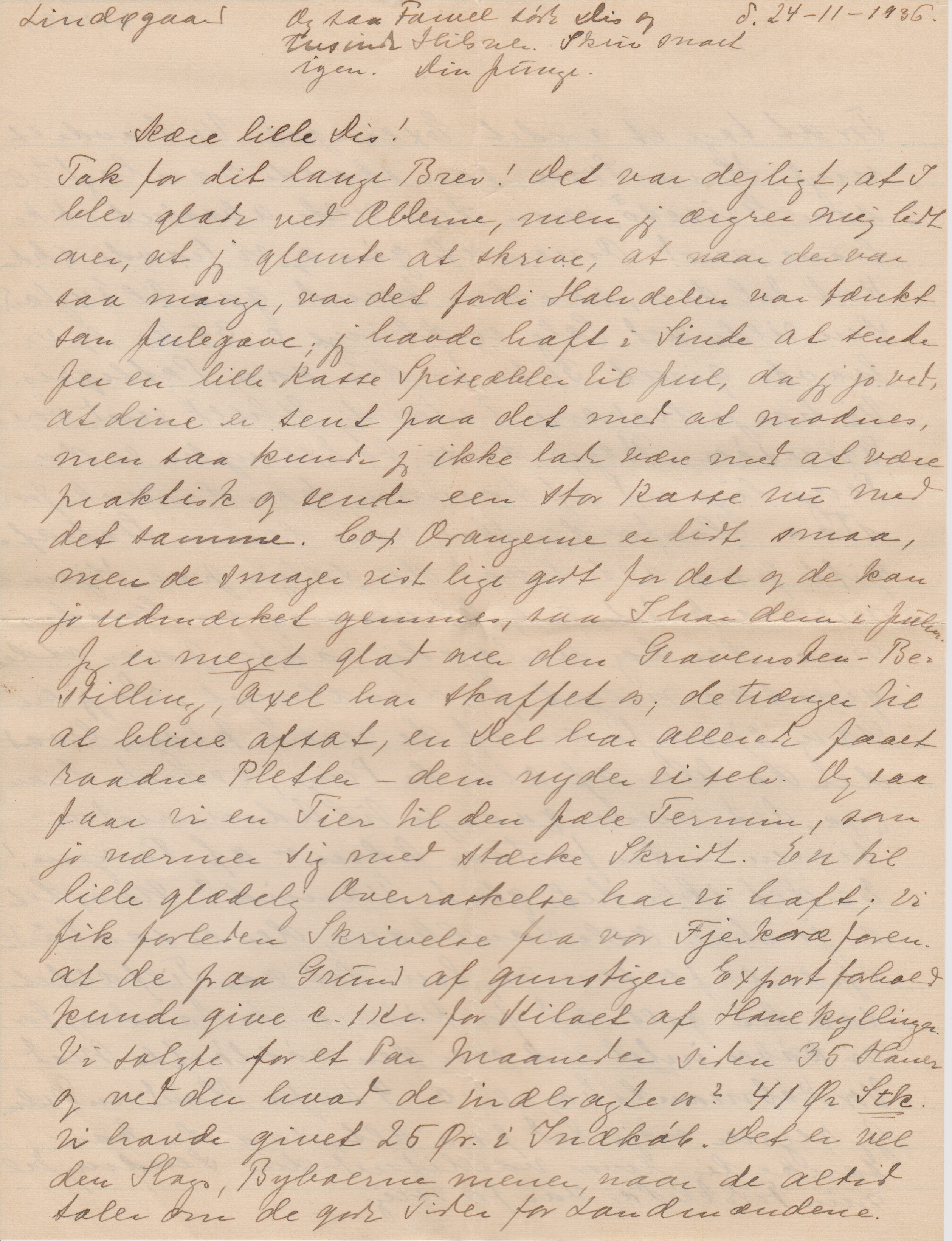 Tak for dit lange Brev. Det var dejligt, at I blev glad ved Æblerne, men jeg ærgrer mig lidt over, at jeg glemte at skrive, at naar der var saa mange, var det fordi Halvdelen var tænkt som Julegave; jeg havde haft i Sinde at sende Jer en lille Kasse Spiseæbler til Jul, da jeg jo ved, at dine er sent paa det med at modnes, men saa kunde jeg ikke lade være med at være praktisk og sende een stor Kasse nu med det samme. Cox Orangerne er lidt smaa, men de smager vist lige godt for det og de kan jo udmærket gemmes, saa I har dem i Julen. Jeg er meget glad over den Gravensten-Bestilling, Axel har skaffet os; de trænger til at blive afsat, en Del har allerede faaet saadanne Pletter – dem nyder vi selv. Og saa faar vi en Tier til den fæle Termin, som jo nærmer sig med stærke Skridt. En til lille glædelig Overraskelse har vi haft; vi fik forleden Skrivelse fra vor Fjerkræforen. at de paa Grund af gunstigere Exportforhold kunde give c. 1 Kr. for Kiloet af Hanekyllinger. Vi solgte for et Par Maaneder siden 35 Haner og ved du hvad de indbragte os? 41 Ør. Stk. Vi havde givet 25 Ør. i Indkøb. Den er vel den Slags, Byboerne mener, naar de altid taler om de gode Tider for Landmændene. For at tage et andet Exempel. Vi havde et ungt Hun-Svin, som skulde være lagt til som Griseso, men den vilde absolut ikke have med Ornen at gøre og vi havde ikke Kort til den, saa den kunde gaa til England. Den vilde ved Salg indbringe c. 35 Kr og vi havde givet 30 Kr for den som Pattegris. Vi har jo desværre bestandig Uheld med vore Grisesøer. Begge disse to Exempler er da Penge lige ud af Lommen, kan du nok forstaa. Hvorfor der skal være denne Strafafgift paa alt hvad der sælges paa Hjemmemarkedet er og bliver mig en Gaade, naar der dog bestandig raabes paa, at der gøres saa meget for Landbruget. Da jeg en Gang spurgte en af de mere kloge, hvad der da blev af alle de Penge, svarede han ”ja, det meste gaar jo til Administrationen” – du forstaar Adm.n af Pengene! Er det ikke det glade Vanvid? Naa, det er jo ikke alle Landboere, der er saa haardt spændt for som vi; hvis det var Tilfældet saa det galt ud for Købmandsstanden, for vi køber intet ud over den nødtørfte Mad. Vor Købmandsbog er c. 9 Kr pr. Hoved om Mdn. Jeg regner nøje ud paa alt, saa du kan tænke dig, hvor værdifuld din Sending til min Fødselsdag var for mig.