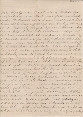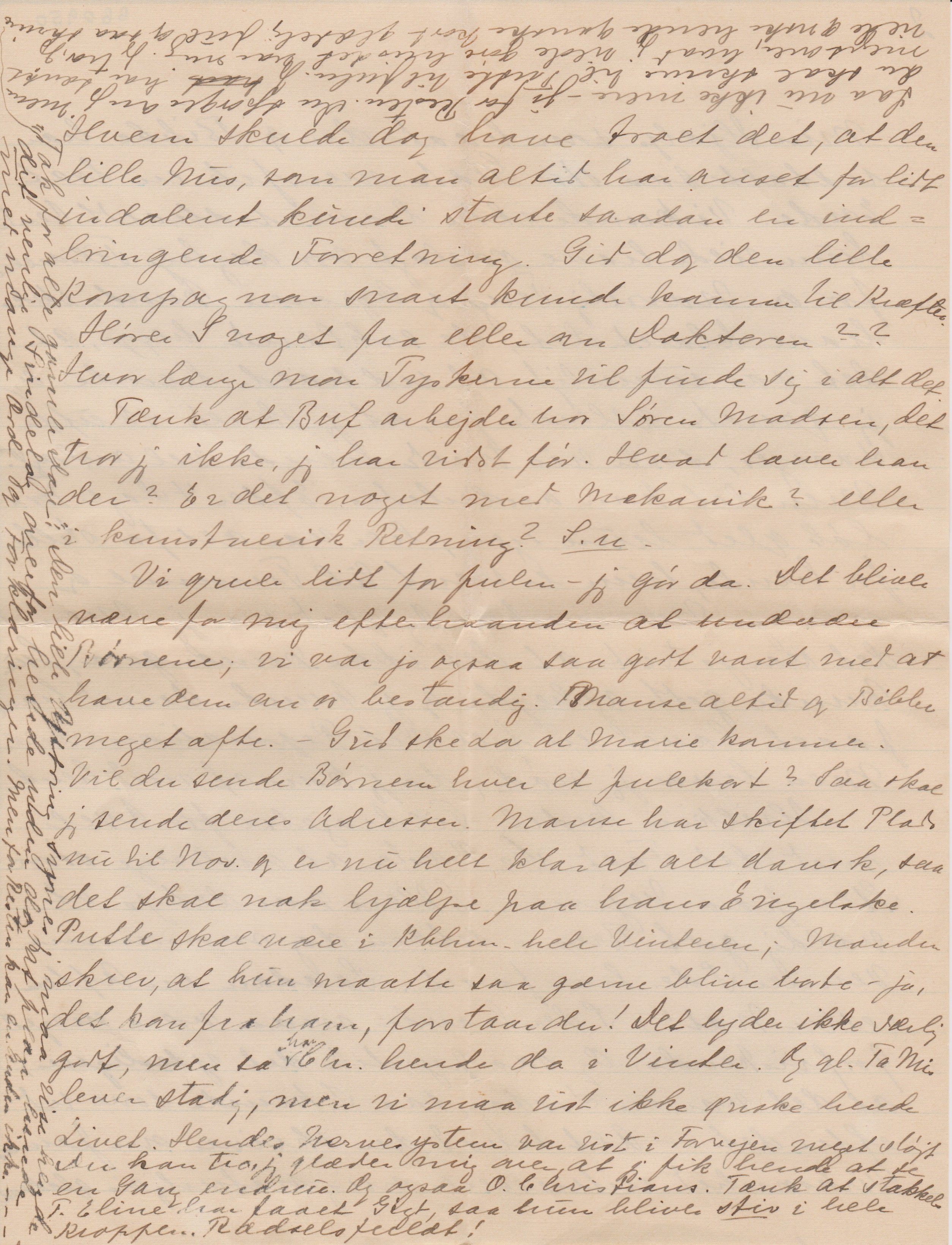 Vi gruer lidt for Julen – jeg gør da. Det bliver værre for mig efterhaanden at undvære Børnene; vi var jo ogsaa saa godt vant med at have dem om os bestandig. Manse altid og Bibbe meget ofte. – Gud ske Lov at Marie kommer. Vil du sende Børnene hver et Julekort? Saa skal jeg sende deres Adresser. Manse har skiftet Plads nu til Nov. og er nu helt klar af alt dansk, saa det skal nok hjælpe paa hans Engelske. Putte skal være i Kbhvn. hele Vinteren; Manden skrev, at hun maatte saa gærne blive helt borte – ja, det kom fra ham, forstaar du! Det lyder ikke særlig godt, men saa har [”har” indsat over linjen] Christine hende da i Vinter. Og gl. Ta Mis lever stadig; men vi maa vist ikke ønske hende Livet. Hendes Nervesystem var vist i Forvejen meget sløjt Du kan tro, jeg glæder mig over, at jeg fik hende at se en Gang endnu. Og ogsaa O. Christian. Tænk at stakkels T. Eline har faaet Gigt, saa hun bliver stiv i hele Kroppen. Rædselsfuldt!