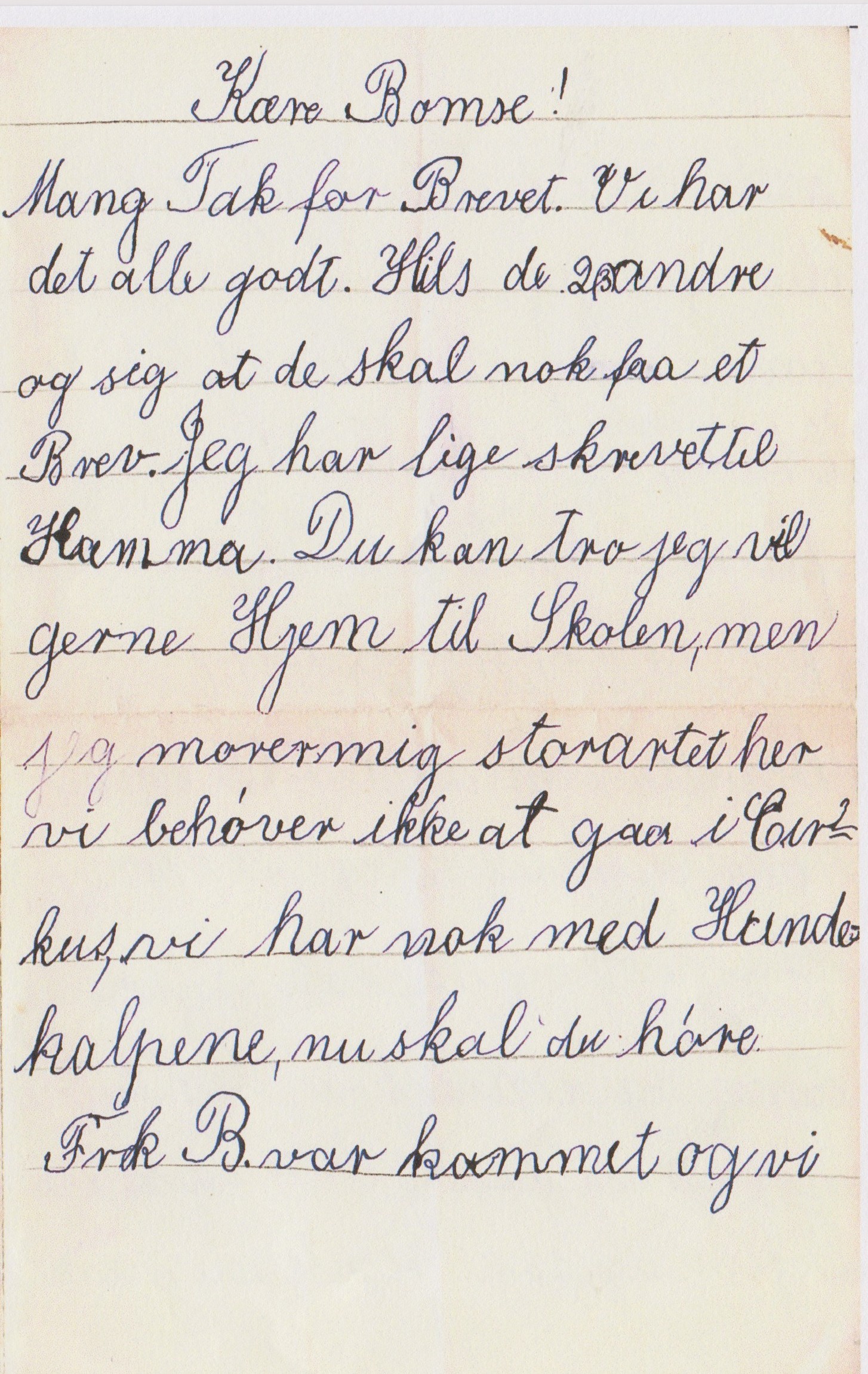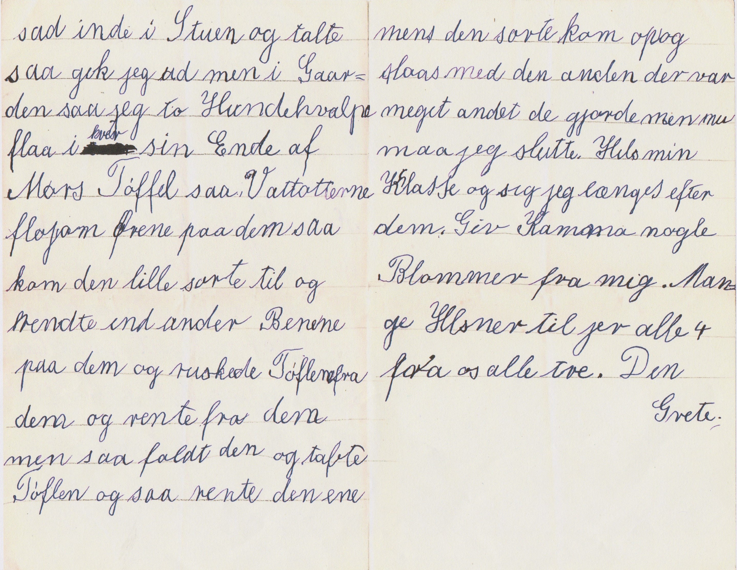Mang Tak for Brevet. Vi har det alle godt. Hils de 2 (3) andre og sig at de nok skal faa et Brev. Jeg har lige skrevet til Kamma. Du kan tro jeg vil gerne hjem til Skolen, men jeg morer mig storartet her vi behøver ikke at gaa i Cirkus, vi har nok med Hundehvalpene, nu skal du høre. Frøken B. var kommet og vi sad inde i Stuen og talte saa gik jeg ud men i Gaarden saa jeg to Hundehvalpe flaa i hver ["hver" indsat over et overstreget ord] Ende af Mors Tøffel saa Vattotterne fløj om Ørerne paa dem saa kom den lille sorte til og rendte ind under Benene paa dem og ruskede Tøflerne fra dem og rente med dem men saa faldt den og tabte Tøflen og rente den ene mens den anden kom op og slaas med den anden der var meget andet de gjorde men nu maa jeg slutte. Hils min Klasse og sig jeg længes efter dem. Giv Kamma nogle Blommer fra mig. Mange Hilsner til jer alle 4 fra os alle tre. Din