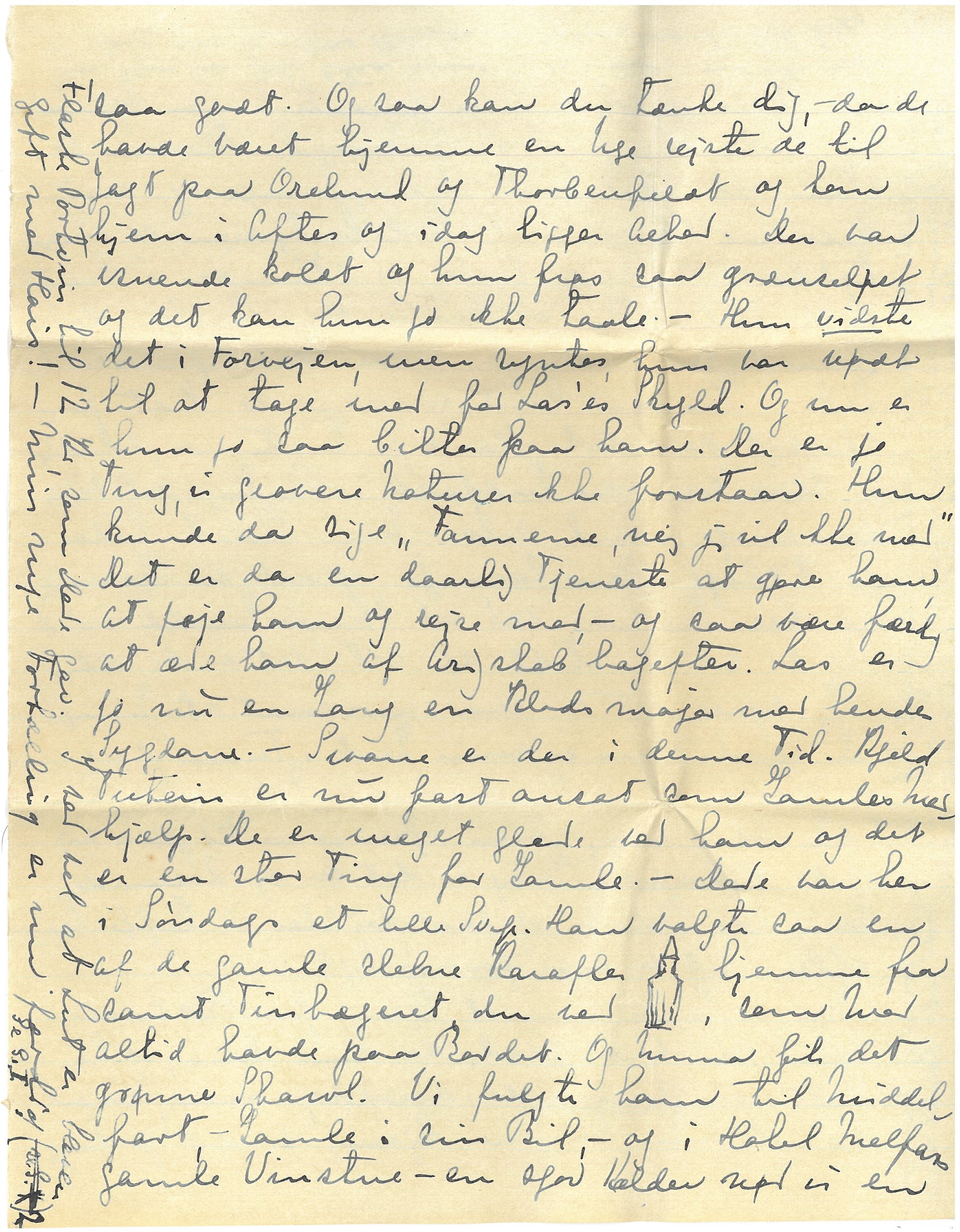 Nu er Lases kommet hjem fra Båxhult. Alhed var saa rask da hun kom og har haft det glimrende deroppe, - men saa snart hun kommer hjem, er det jo knap saa godt. Og saa kan du tænke dig, - da de havde været hjemme en Uge rejste de til Jagt paa Orelund og Torbenfeldt og kom hjem i Aftes og idag ligger Alhed. Der var isnende koldt og hun frøs saa grænseløst og det kan hun jo ikke taale. - Hun vidste det i Forvejen, men syntes, hun var nødt til at tage med for Las's Skyld. Og nu er hun jo saa bitter paa ham. Der er jo Ting, vi grovere Naturer ikke forstaar. Hun kunde da sige "Fanneme, nej jeg vil ikke med" Det er da en daarlig Tjeneste at gøre ham, at føje ham og rejse med, - og saa være færdig at æde ham af Arrigskab bagefter. Las er jo nu en Gang en Klodsmajor med hendes Sygdom. - Swane er der i denne Tid. Kjeld Tutein er nu fast ansat som Gamles Hushjælp. De er meget glade ved ham og det er en stor Ting for Gamle. - Dede var her i Søndags et lille Svip. Han valgte sa en af de gamle slebne Karafler [tegning indsat] hjemme fra samt Tinbægeret du ved, som Mor altid havde paa Bordet. Og Minna fik det grønne Shawl. Vi fulgte ham til Middelfart - Gamle i sin Bil, - og i Hotel Middelfarts gamle Vinstue - en sjov Kælder nød vi en [indsat i venstre margen s. 6; på højkant:] Flaske Portvin til 12 Kr, som Dede gav. I ser vel at Lut er bleven gift med Hais! - Min nye Fortælling er nu færdig Se S. I (se S. X) ["(se S. X)" overstreget] 2
