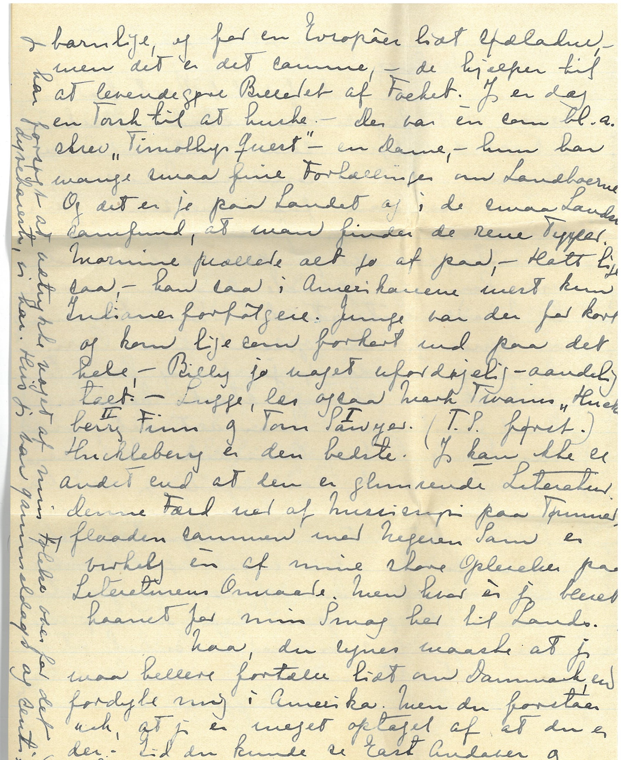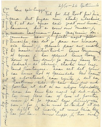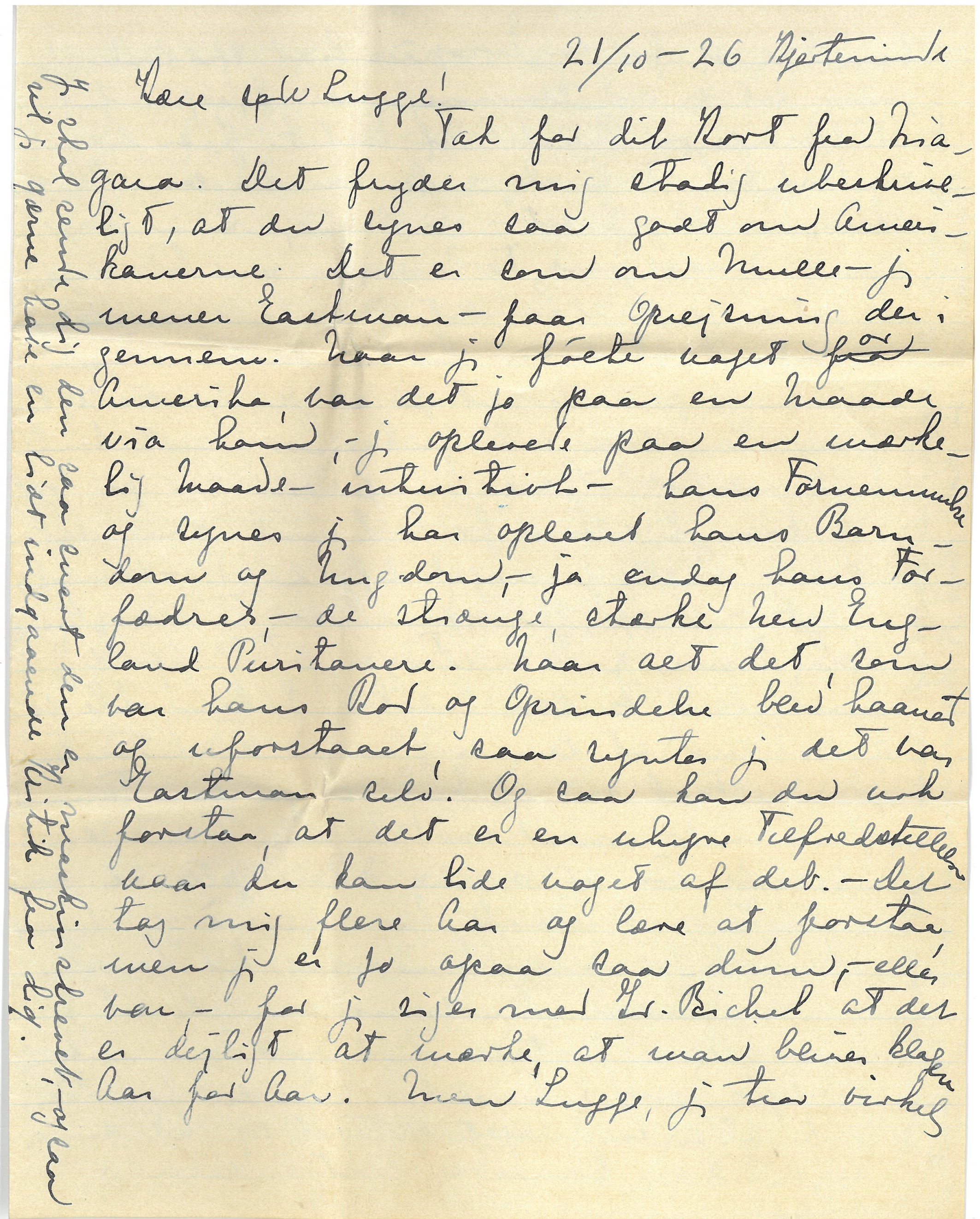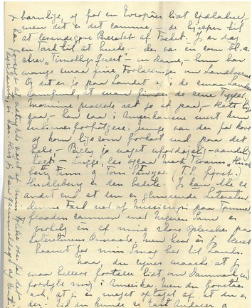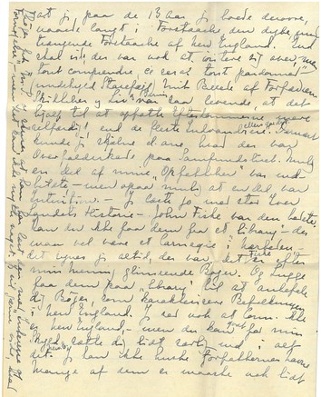 Tak for dit Kort fra Niagara. Det fryder mig stadig ubeskriveligt, at du synes saa godt om Amerikanerne. Det er som om Nulle - jeg mener Eastman - faar Oprejsning der i gennem. Naar jeg følte noget fra or ["ra" overstreget; "or" indsat over linjen] Amerika, var det jo paa en Maade via ham, - jeg oplevede paa en mærkelig Maade - intuitivt - hans Fornemmelse og synes jeg har oplevet hans Barndom og Ungdom, - ja endog hans Forfædres, - de strænge, stærke [ulæseligt ord] England Puritanere. Naar alt det, som var hans Rod og Oprindelse blev haanet og uforstaaet, saa syntes jeg det var Eastman selv! Og saa kan du nok forstaa, at det er en uhyre Tilfredsstillelse naar du kan lide noget af det. - Det tog mig flere Aar og lære at forstaa, men jeg er jo ogsaa saa dum, - eller var, - for jeg siger med Dr. Bichel at det er dejligt at mærke, at man bliver klogere Aar for Aar. Men Lugge, jeg tror virkelig at jeg paa de 13 Aar jeg boede derovre, naaede langt i Forstaaelse, den dybe Gennemtrængende Forstaaelse af New England. Gud skal vide, der var nok at irritere sig over, men "tout comprendre, cè serat tout pardonner" - (undskyld Stavefæjl) Mit Billede af Forfædrenes Skikkelser og Liv og Gærning ["og Gærning" indsat over linjen] var saa levende, at det hjalp til at opfatte Efterkommerne mere retfærdigt, end de fleste Indvandrere ellers gør det. [ellers gør det" indsat over linjen] Dernæst kunde jeg skjælne el. ane hvor der var Overfaldsskade paa Samfundslivet. Mulig en Del af mine "Opfattelser" var indbildte, - men ogsaa mulig at en Del var Intuition. - Jeg læste jo med stor Iver Landets Historie - John Fiske var den bedste. Kan du ikke faa dem fra et "library" - der maa vel være et Carnegie i Nærheden, - det synes jeg altid, der var. Det Fiske ["Fiske" indsat over linjen] er efter min Mening glimrende Bøger. Og Lugge faa dem paa "library" til at anbefale dig Bøger, som karakteriserer Befolkningen i New England. Jeg ved nok at Conn. ikke er New England, - men du kan godt ["godt" indsat over linjen] for min Skyld sætte dig lidt særlig ind i alt det New E. ["New E. indsat over linjen] Jeg kan ikke huske Forfatternes Navne Mange af dem er maaske lidt barnlige og for en Europæer lidt sødladne, - men det er det samme, - de hjælper til at levendegøre Billedet af Folket. Jeg er dog en Torsk til at huske. - Der var en som bl.a. skrev "Timothys Quest" - en Dame, - hun har mange smaa fine Fortællinger om Landboerne. Og det er jo paa Landet og i de smaa Landsbysamfund, at man finder de rene Typer. Mornine prællede alt jo af paa, - Hatt ligesaa, - han saa i Amerikanerne mest kun Indianerforfølgere. Junge var der for kort og kom ligesom forkert ind paa det hele, - Billy jo noget ufordøjelig - aandelig talt. - Lugge, læs ogsaa Mark Twains "Huckleberry Finn ["II" indsat over linjen] og Tom Sawyer. ["I"] indsat over linjen] (T.S. først.) Huckleberry er den bedste. Jeg kan ikke se andet end at den er glimrende Literatur. Denne Færd ned af Missisipi paa Tømmerflaaden sammen med Negeren Sam er virkelig en af mine store Oplevelser paa Literaturens Omraade. Men hvor er jeg blevet haanet for min Smag her til Lands.