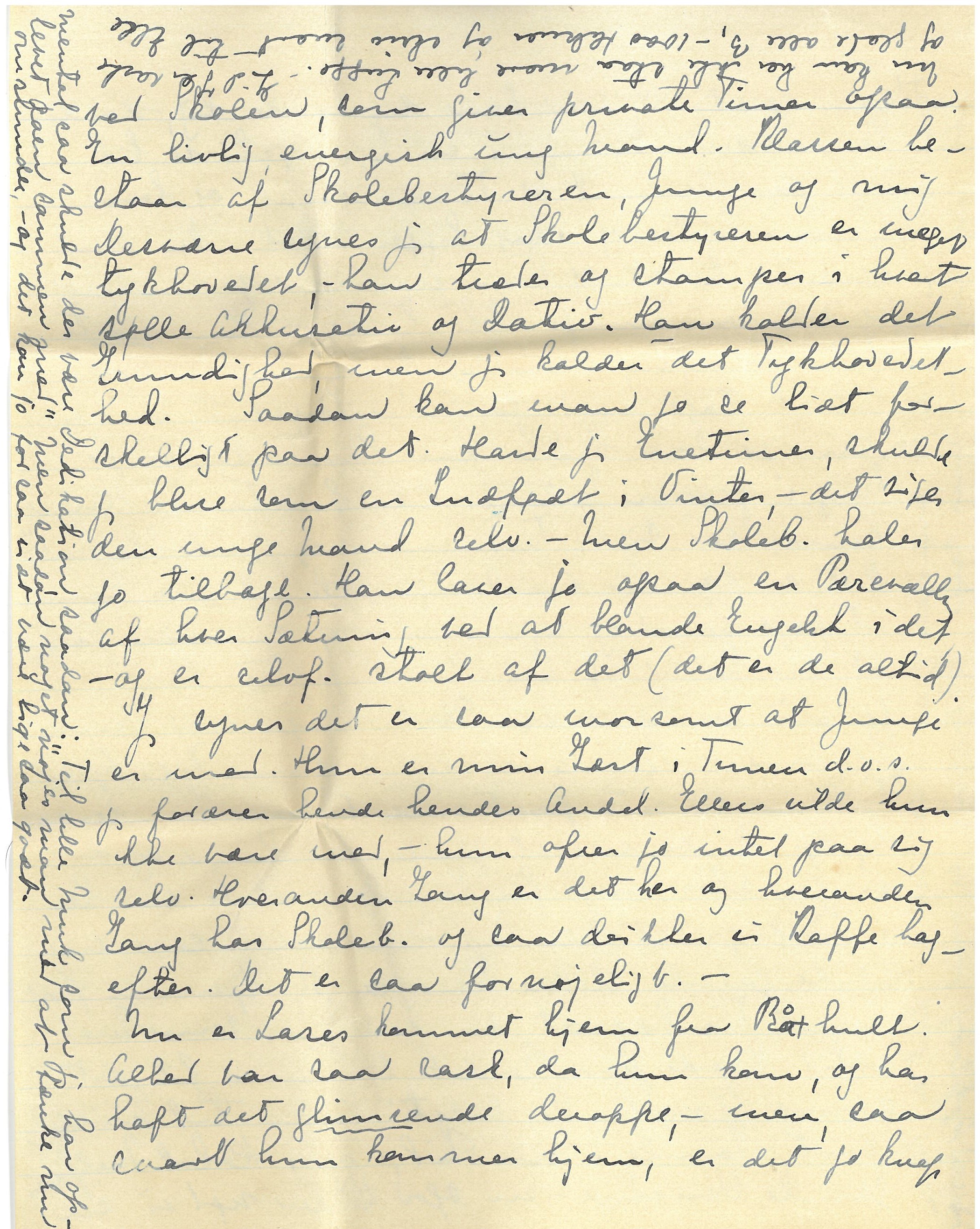 Ja, hvad er der her. - Nu er det Efteraar og Bladene er faldne ude i min lille Have, men der kan endnu plukkes en Del Lathyrus og Petunia og Reseda og Georginer. Jeg har faaet mine brune Chenille-Vintergardiner op, - som Mor ordnede for mig i fjor, - de luner og hygger umaadeligt. Her er yndigt og jeg er mere end nogensinde forelsket i mit lille "komplette" Hus. Af Begivenheder: Thøgers nye Digtsamling, som hedder "Søndengalm" er udkommet. Det er altsammen Digte fra og om Italien. Jeg spejder efter Anmeldelser. De betegner afgjort et Vendepunkt i hans Produktion, og jeg er spændt paa, hvad Side, man mener han er vendt til. Det er en Fornyelse, det er der ikke Tvivl om. - Lille Muse og Lille rejste d. 21 Sept. det var et slemt Savn, - men det er saa morsomt at tænke paa, at de har været her og at de hyggede sig her. Gr. tog 5 Pund paa af min gode Mad!! Thøger var her og hilse paa dem paa Hjemrejse fra Aakjærfest og gamle Gr. og jeg kørte ham i Bil til Jelling hvor han saa tog Toget. Mon jeg dog ikke har skrevet det. - Vi var ved Faarup Sø, som vi ogsaa var ved. - Lugge, vi har en "tysk Aften." Her er nemlig en delvis indfødt ung Lærer ved Skolen, som giver private Timer ogsaa. En livlig, energisk ung Mand. Klassen bestaar af Skolebestyreren, Junge og mig. Desværre synes jeg at Skolebestyreren er meget tykhovedet, - han træder og stamper i hvert sølle Akkusativ og Dativ. Han kalder det Grundighed, men jeg kalder det Tykhovedethed. Saadan kan man jo se lidt forskelligt paa det. Havde vi Enetimer, skulde jeg blive som en Indfødt i Vinter, - det siger den unge Mand selv. - Men Skoleb. haler jo tlbage. Han laver jo ogsaa en Pærevælling af hver Sætning ved at blande Engelsk i det, - og er selvf. stolt af det (det er de altid). Jeg synes det er saa morsomt at Junge er med. Hun er min Gæst i Timen d.v.s. jeg forærer hende hendes Andel. Ellers vilde hun ikke være med, - hun ofrer jo intet paa sig selv. Hveranden Gang er det her og hveranden Gang hos Skoleb. og saa drikker vi Kaffe bagefter. Det er saa fornøjeligt. -
