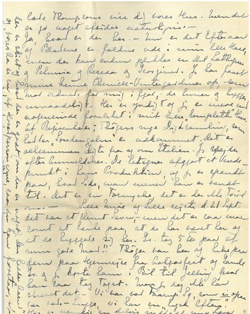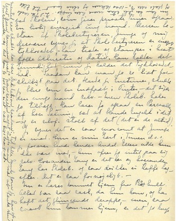 [Indsat i venstre margen s. 2; på højkant:] Thøger fik M.S. og skriver, at han har læst den med "Interesse og Fornøjelse", - men det kan ikke nytte noget. Jeg vil gærne vide, hvad [Indsat i venstre margen s. 3; på højkant:] der er skidt og hvad der er godt (om der er noget). Den hedder "Aaen" og vores Aa er en af Hovedpersonerne, saa du kan forstaa, at [Indsat i venstre margen s. 4; på højkant:] jeg har forsøgt at udtrykke noget af min Følelse for det dyrebareste, vi har. Hvis jeg var gammeldags og senti- (fort. Side 6) [Indsat i venstre margen s. 6; på højkant:] mental saa skulde der være Dedikation, saadan: "Til lille Muk som jeg har oplevet Aaen sammen med." Men saadan noget nøjes man med at tænke nu omstunder, - og det kan jo for saa vidt være lige saa godt. [Indsat i venstre margen s. 1; på højkant:] Jeg skal sende dig den saa snart den er maskinskrevet, - og saa vil jeg gærne have en lidt indgaaende Kritik fra dig.