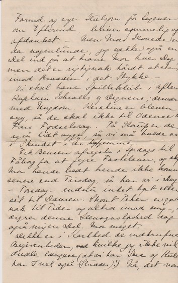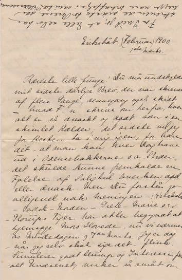 Kæreste lille Junge! Du må undskylde mit sidste dårlige Brev, der var skrevet af flere Gange, dennegang også skidt – hvad F.n skrive nu herfra, hvor alt er så dvaskt og dødt som i en skimlet Kælder; det sidste vil jeg for Resten ta i mig igen, for bare dèt - at man hver Dag traver ud i Odensebakkerne o a Steder, det skulde kunne fremkalde en Følelse af Salighed hverken død eller dvask. Men du forstår alligevel nok Meningen - : Selskaber – Vadsk – Uorden – Grete – Marie o s v – Glorups Piger har atter begyndt at hjemsøge Mors Hoved, nu vi nærmer os Mindedagen d 7de Marts. Jeg er dog – når jeg selv skal sige det – flink. Simulerer godt Humeur og Interesse for alt Uvæsenet, virker så småt om Formd. og Syer Hulsøm på Lagener om Eftermd., bliver sømmelig og afdanket. – Men Mors Hovede er da nogenlunde, jeg sætter også en Del ind på at have Mor hver Dag, men det er rigtignok hårdt at stampe mod Brodden i det Stykke. –