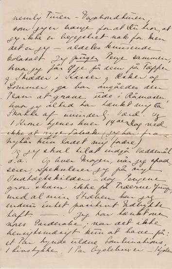Og jeg skal til at undgå Væddemål o.a. Og hver Morgen, når jeg spadserer, spekulerer jeg på nye Indtægtskilder – dog Pengene gror skam ikke på Træerne Junge, med al min Stræben har jeg endnu intet positivt Udbytte haft. - . Jeg har tænkt over vores Garderobe; var det ikke hensigtsmæssigt kun at have på: et Par tynde uldne Combinations. 1 Livstykke, 1 Par Cyclebuxer – Kjolen Strømper og Støvler. Med: 1 ulden Combinations, 1 Par Sko (?) Toiletsager (efter Behag) En Voksdugscape var vist nødvendig, men kan jo hjemmelaves. C’est tout bagage! - . Føden må vi jo have; jeg har tænkt mig, at følgende var bedst og billigst!: 1) Morgenkaffe 2) Middagsmad. Og ikke mere Mad. Jeg forsikrer Dig, at det er en Vane med den Æden også om Aftenen. – Jeg drømmer nu om - Holland. Tænk lidt i Ro over Sagen Junge! Holland som vi dog så ofte har tænkt på, og når vi nu var ved det! Vi kunde ikke søge et el. a. Legat? For trængende ensomme Piér? Det forekommer mig, at et sådant gives. - . Jeg kommer ved Lejlighed et lille Svip ind at snakke ordentlig med Dig om det. Min gamle italienske Sølvklokke vil jeg sælge – en Rejse er dog at foretrække.
