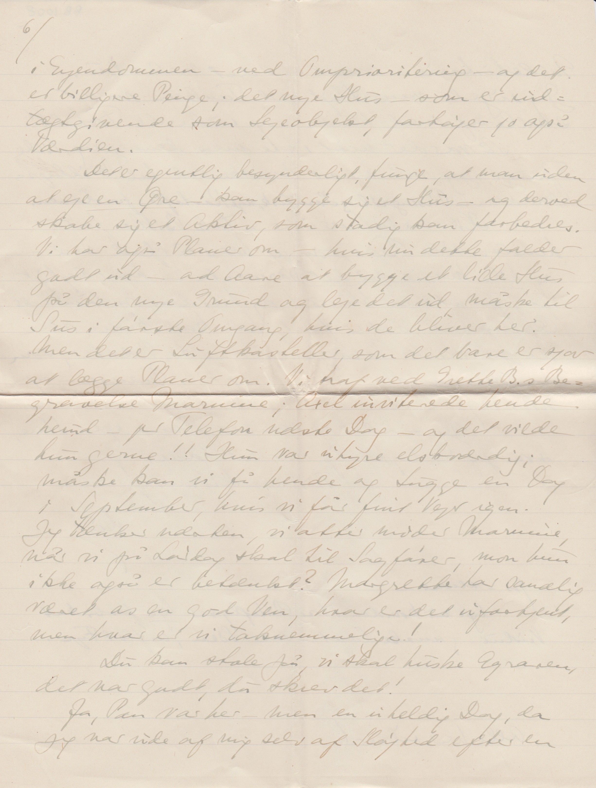 Det er egentlig besynderligt, Junge, at man uden at eje en Øre - kan bygge sig et Hus – og derved skabe sig et Aktiv, som stadig kan forbedres. Vi har også Planer om – hvis nu dette falder godt ud – ad Aare at bygge et lille Hus på den nye Grund og leje det ud, måske til Sus i første Omgang, hvis de bliver her. Men det er jo Luftkasteller, som det bare er sjov at lægge Planer om. Vi traf ved Grethe B.s Begravelse Mornine; Axel inviterede hende herud - pr. Telefon næste Dag – og det vilde hun gerne!! Hun var yhyre elskværdig; måske kan vi få hende og Lugge en Dag i Spetember hvis vi får fint Vejr igen. Jeg tænker næsten, vi atter møder Mornine, når vi på Lørdag skal til Sagfører, mon hun ikke også er betænkt? Margrethe har sandelig været os en god Ven, hvor er det ufortjent, men hvor er vi taknemmelige!