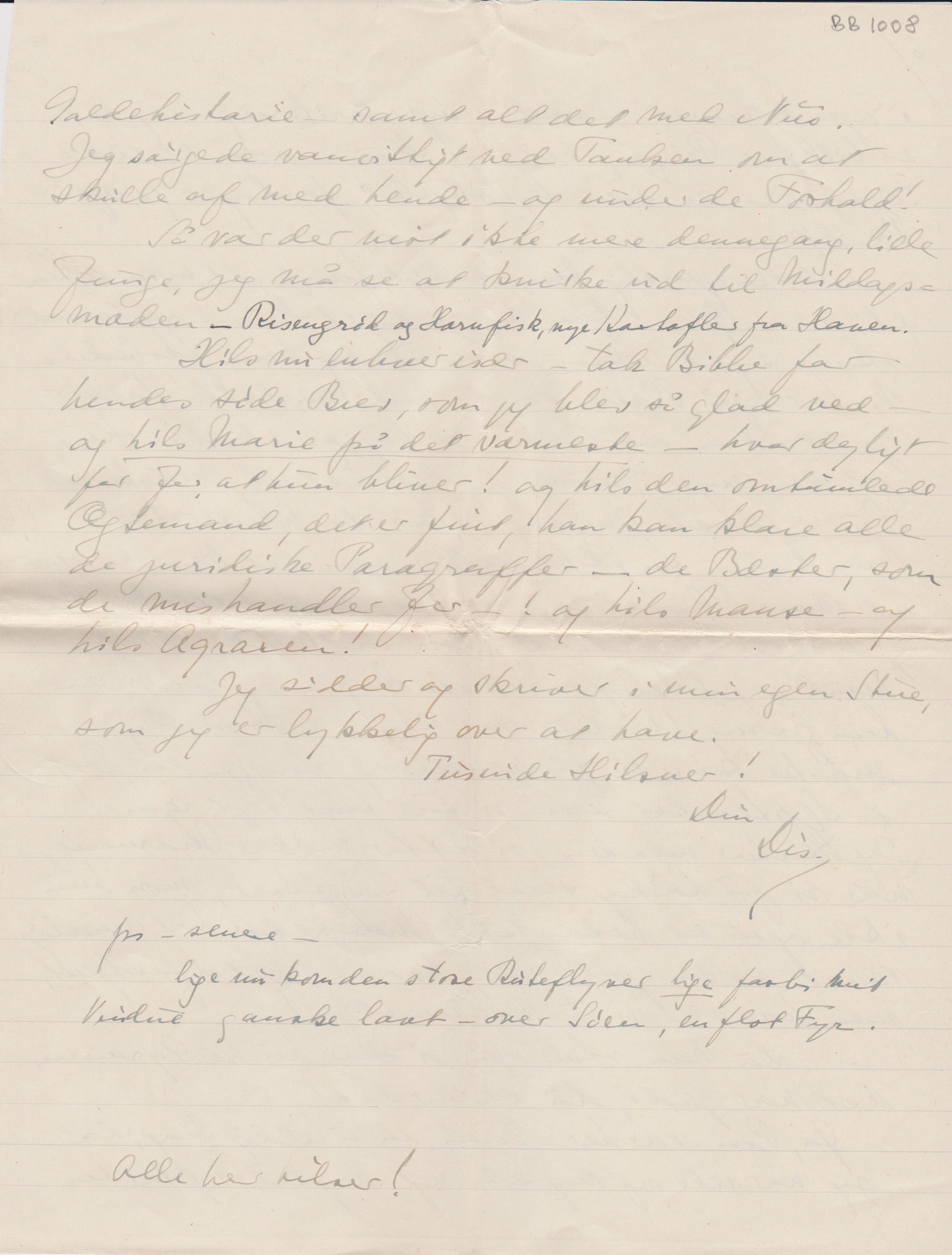 Hils nu enhver især – tak Bibbe for hendes søde Brev, som jeg blev så glad ved og _hils Marie på det varmeste - hvor dejligt for Jer, at hun bliver! og hils den omtumlede Ægtemand, det er fint, han kan klare alle de juridiske Paragraffer – de Bæster, som de mishandler Jer - . og hils Manse – og hils Agraren!