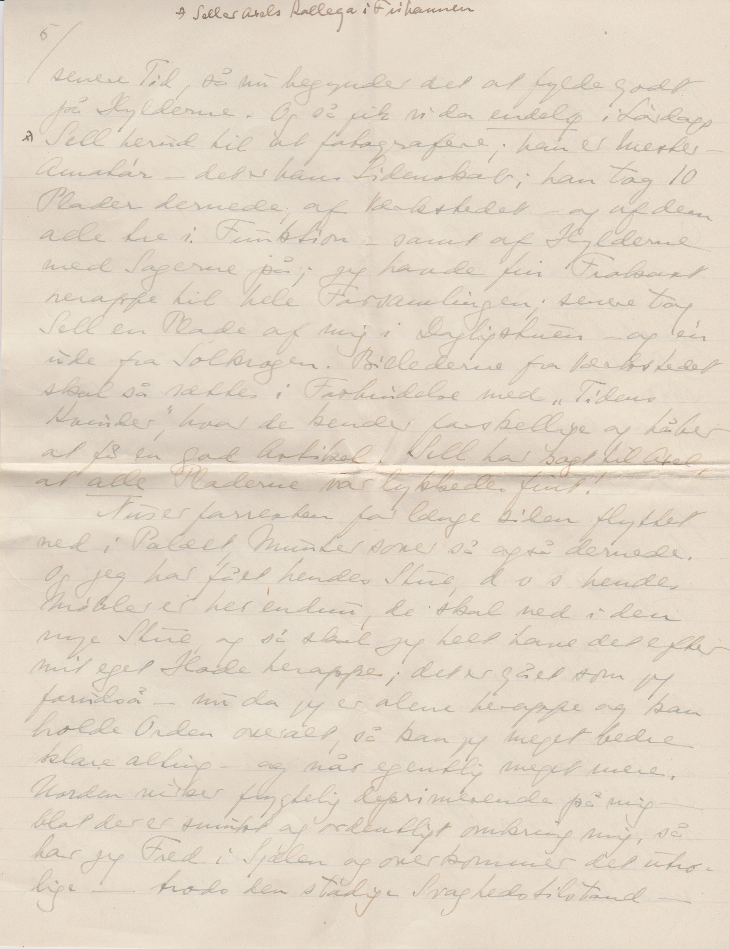 5) senere Tid, så nu begynder det at fylde godt på Hylderne. Og så fik vi da endelig i Lørdags x ["x" indsat i venstre margen] Sell herud til at fotografere: han er Mester-Amatør – det er hans Lidenskab; han tog 10 Plader dernede, af Værkstedet - og af dem alle tre i Funktion – samt af Hylderne med Sagerne på; jeg havde fin Frokost heroppe til hele Forsamlingen; senere tog Sell en Plade af mig i Dagligstuen - og èn ude på Solkrogen. Billederne fra Værkstedet skal så sættes i Forbindelse med ”Tidens Kvinder”, hvor de kender forskellige og håber at få en god Artikel. Sell har sagt til Axel, at alle Pladerne var lykkedes fint.