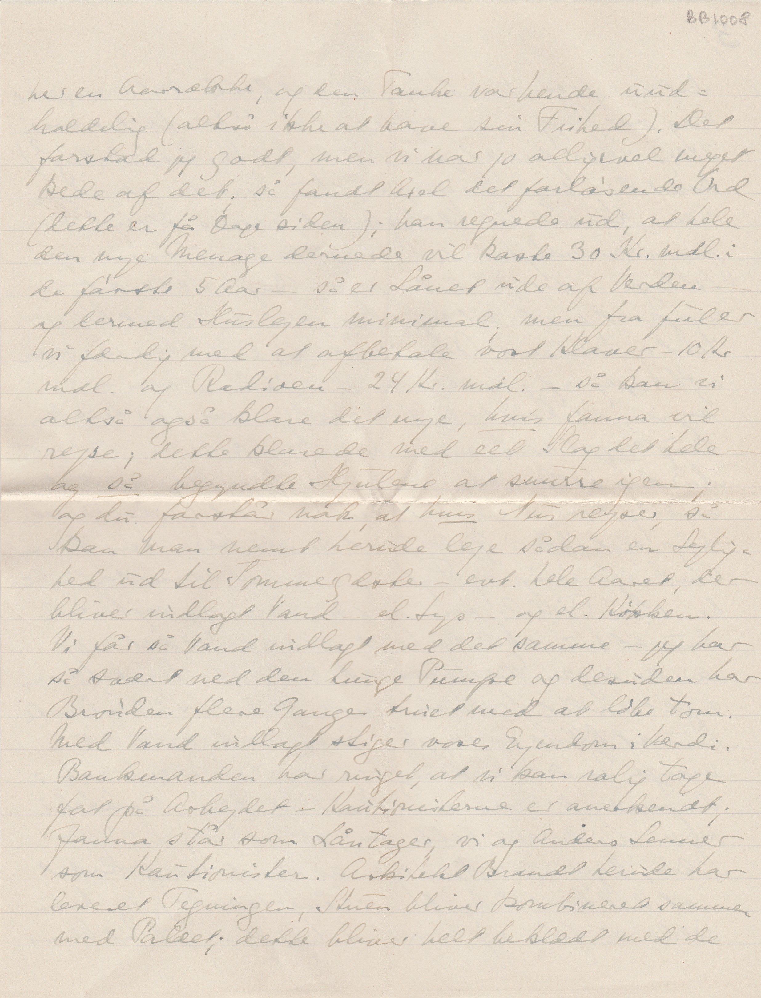 Nå, men så må vi så nøjes med Pennen, Junge. Den Mary-Affaire har dog udviklet sig nederdrægtigt; jeg sagde nu strax til Axel, det er den Mælkefamilie som trækker hende ned – for så slem var hun da ikke før? Skønt Axel sagde – efter at have set hende ved det lille korte Besøg lige efter Brylluppet, da vi kom sammen med Balslevs – Axel sagde om Mary: ”hun er ikke rar”. Han har en ganske forbavsende Evne til ved første Øjekast at se sine Folk an – og det holder altid Stik. Kan du forresten huske, hvad du engang skrev i et Brev til mig, at Mary – da Forlovelsen var hævet – sagde – eller skrev? til dig, at bare hun endda kunde komme og være Pige på Lindøgård, hun vilde slide som en Karl, bare hun fik Lov at være Tinge nær! I må da endelig ikke lade hende plukke Jer for Indbo, men holde på den Kendsgerning, at Tinge intet har – så ved en påtvungen ”Deling”, vilde det vel endda gå ud over Mary selv, juridisk set – efter hendes Ord: hvad dit er – er også mit – det gælder også omvendt! Det er der naturligvis ikke tale om, men det burde foreholdes Mary!