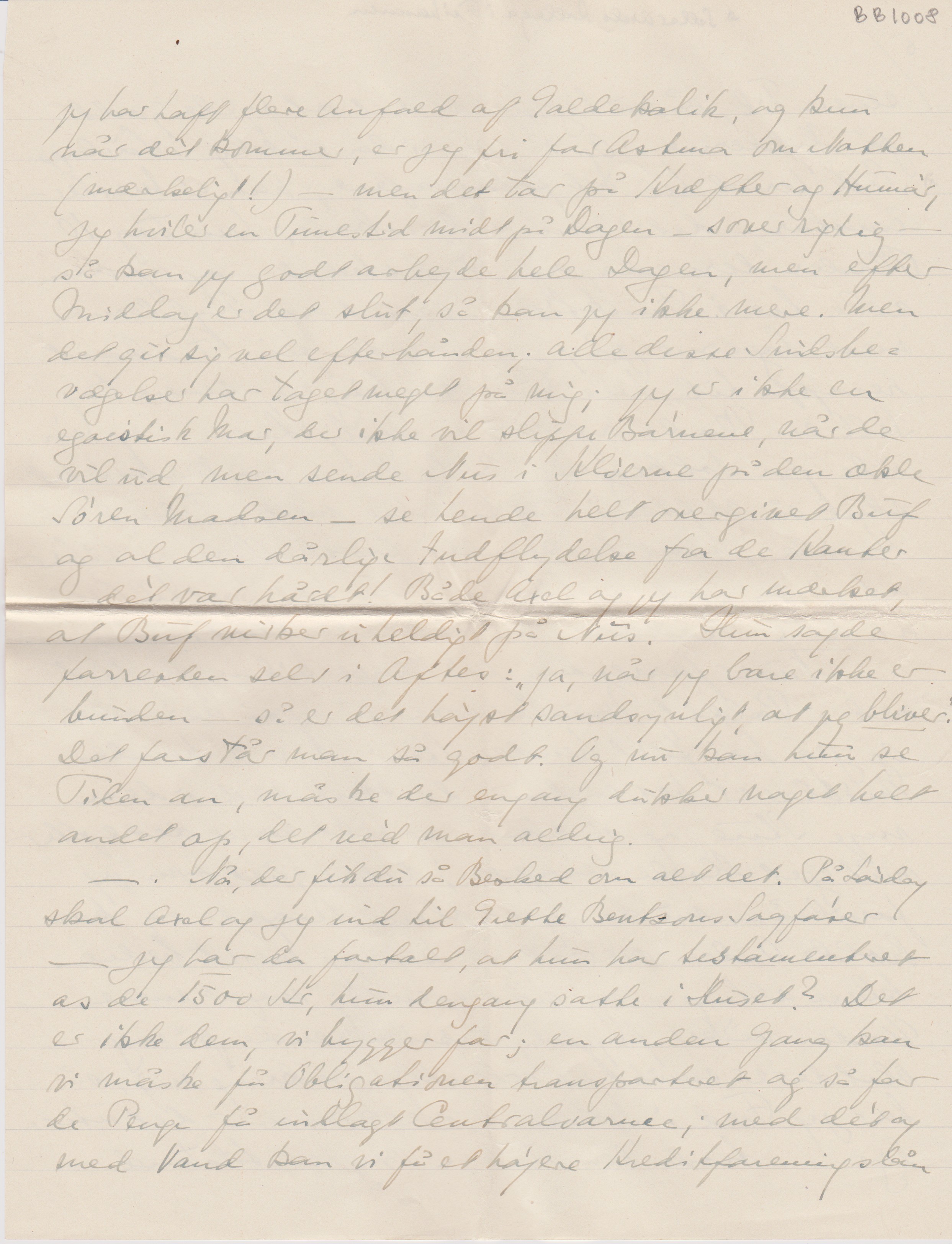 - Nå, der fik du så Besked om alt det. På Lørdag skal Axel og jeg ind til Grethe Bentzons Sagfører --- Jeg har da fortalt, at hun har testamenteret os de 1500 Kr, hun dengang satte i Huset? Det er ikke dem, vi bygger for; en anden Gang kan vi måske få Obligationen transporteret og så for de Penge få indlagt Centralvarme; med dèt og med Vand kan vi få et højere Kreditforeningslån