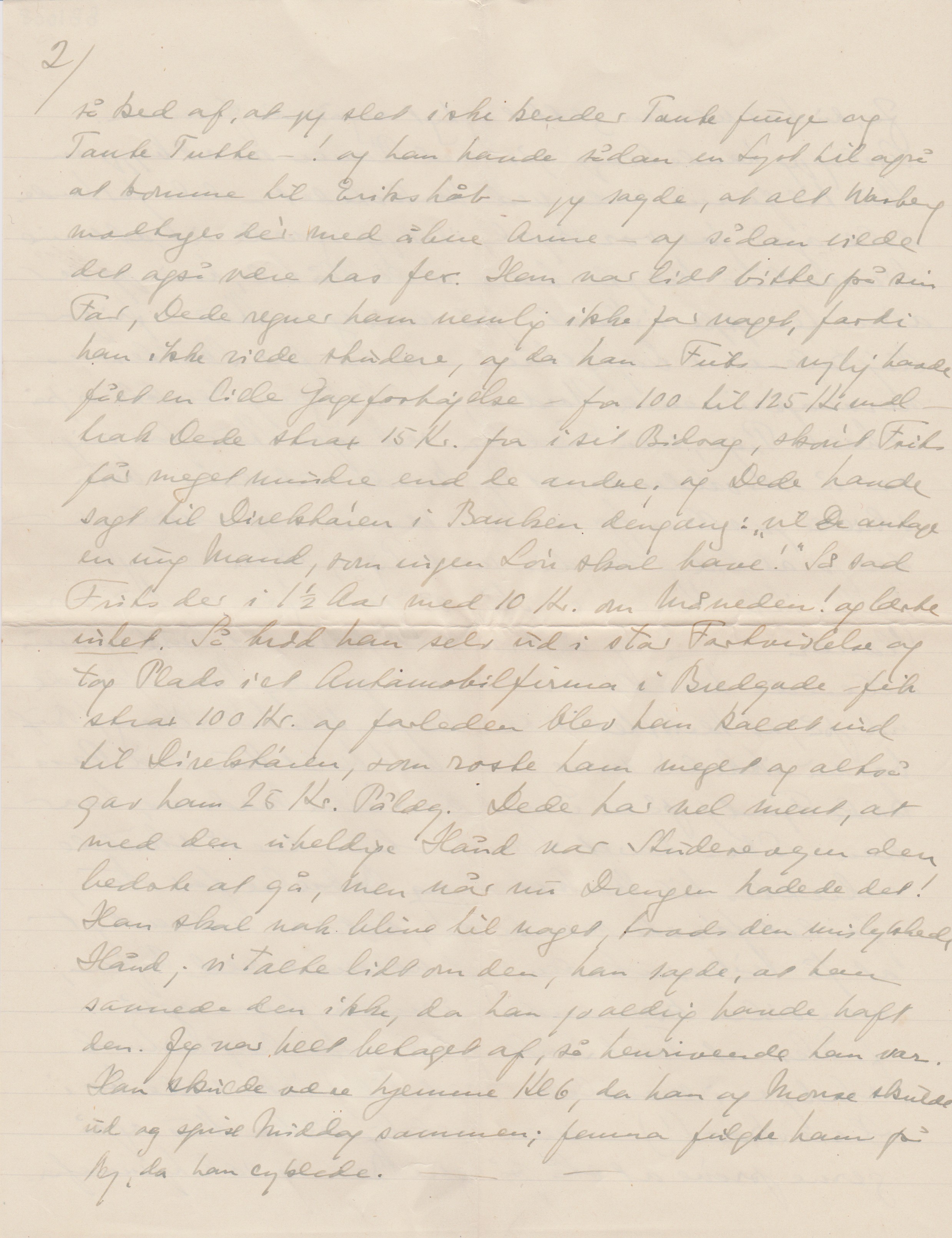 så ked af, at jeg slet ikke kender Tante Junge og Tante Tutte - , ! og han havde sådan en Lyst til også at komme til Erikshåb – jeg sagde, at alt Warberg modtages dèr med åbne Arme – og sådan vilde det også være hos Jer. Han var lidt bitter på sin Far, Dede regner ham nemlig ikke for noget, fordi han ikke vilde studere, og da han – Frits – nylig havde fået en lille Gageforhøjelse – fra 100 til 125 Kr mdl – trak Dede strax 15 Kr. fra i sit Bidrag, skønt Frits får meget mindre end de andre; og Dede havde sagt til Direktøren i Banken dengang: ”vil De antage en ung Mand, som ingen Løn skal have!” Så sad Frits der i 1½ Aar med 10 Kr. om Måneden! og lærte intet. Så brød han selv ud i stor Fortvivlelse og tog Plads i et Automobilfirma i Bredgade – fik strax 100 Kr. og forleden blev han kaldt ind til Direktøren, som roste ham meget og altså gav ham 25 Kr. Pålæg. Dede havde vel ment, at med den uheldige Hånd var Studerevejen den bedste at gå, men når nu Drengen hadede det! Han skal nok blive til noget, trods den mislykkede Hånd; vi talte lidt om den, han sagde, at han savnede den ikke, da han jo aldrig havde haft den. Jeg var helt betaget af, så henrivende han var. Han skulde være hjemme Kl 6, da han og Manse skulde ud at spise Middag sammen; Janna fulgte ham på vej, da han cyklede. - -