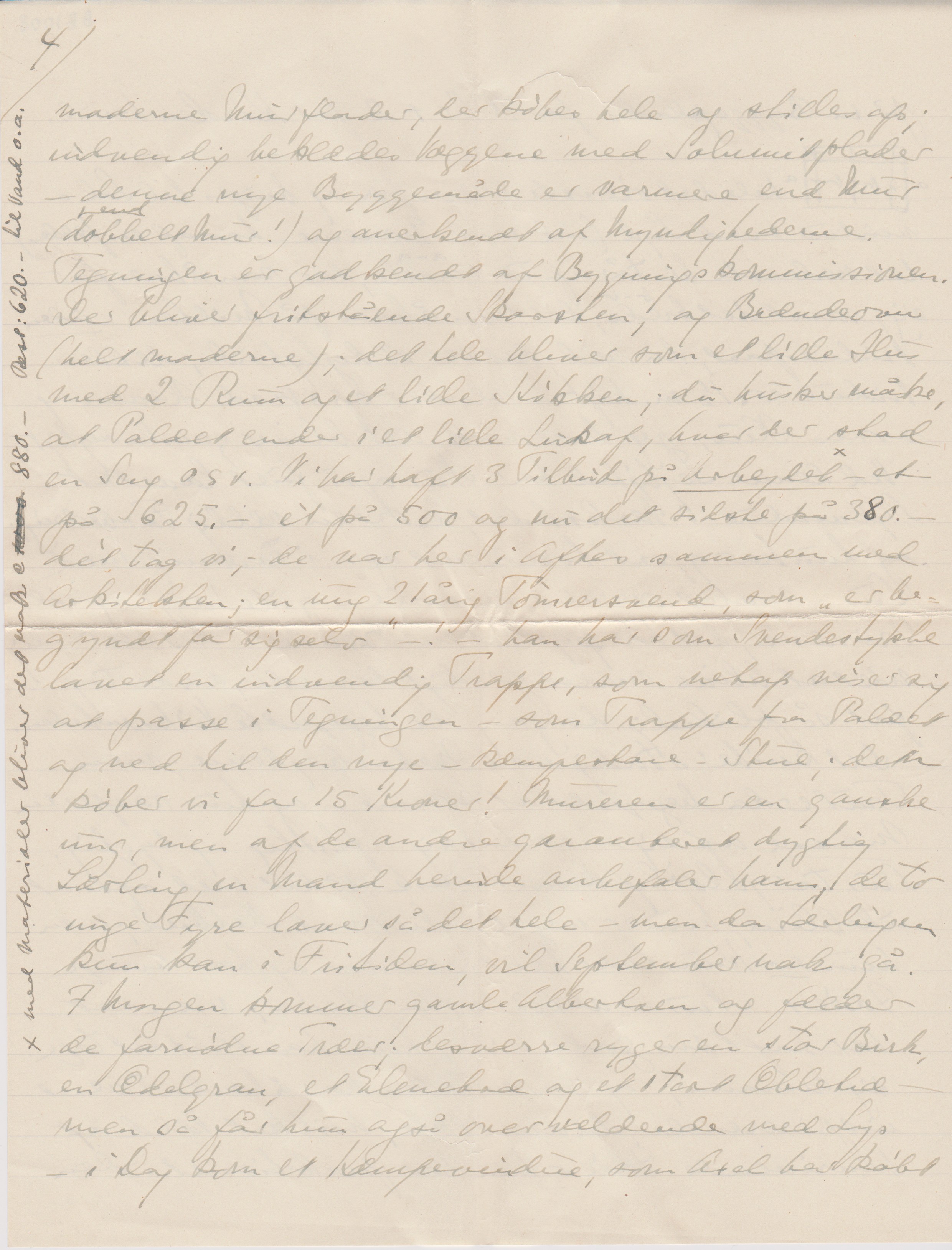 [Indsat på siden mærket "4"; lodret i venstre margen:] X med Materialer bliver det nok c 1000 ["1000" overstreget] 880. – Rest: 620. – til Vand o.a.