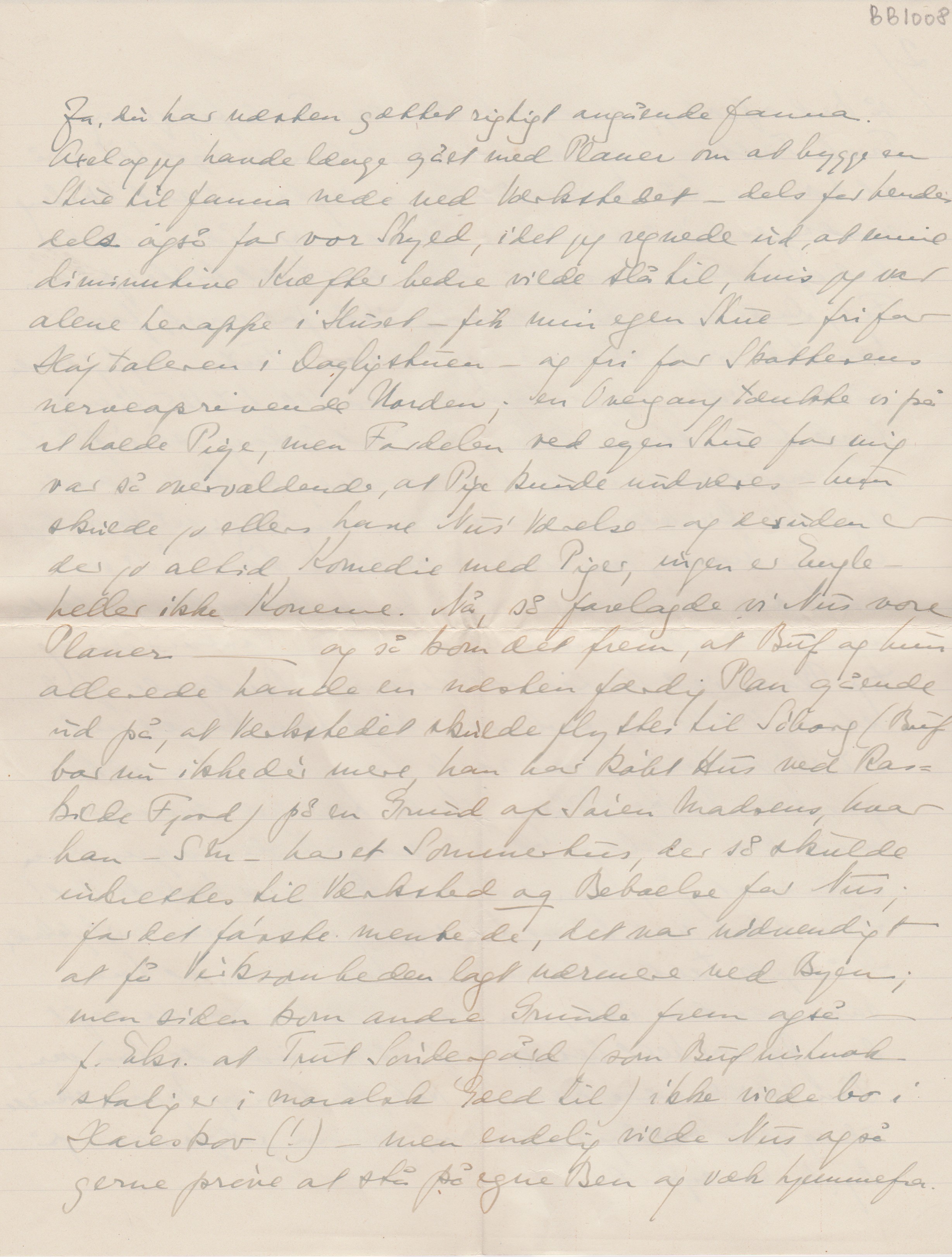 Ja, du havde næsten gættet rigtigt angående Janna. Axel og jeg havde længe gået med Planer om at bygge en Stue til Jnna nede ved Værkstedet – dels for hendes dels også for vor Skyld, idet jeg regnede ud, at mine diminutive Kræfter bedre vilde slå til, hvis jeg var alene heroppe i Huset – fik min egen Stue – fri for Højtaleren i Dagligstuen – og fri for Skatterens nerveoprivende Uorden; en Overgang tænkte vi på at holde Pige, men Fordelen ved egen Stue for mig var så overvældende, at Pige kunde undværes – hun skulde jo ellers have Nus’ Værelse – og desuden er der jo altid Komedie med Piger, ingen er Engle – heller ikke Konerne. Nå, så forelagde vi Nus vore Planer - og så kom det frem, at Buf og hun allerede havde en næsten færdig Plan gående ud på, at Værkstedet skulde flyttes til Søborg (Buf bor nu ikke dèr mere, han har købt Hus ved Roskilde Fjord) på en Grund af Søren Madsens, hvor han – SM – har et Sommerhus, der så skulde indrettes til Værksted og Beboelse for Nus; for det første mente de, det var nødvendigt at få Virksomheden lagt nærmere ved Byen; men siden kom andre Grunde frem også – f. Eks. at Trut Søndergård (som Buf vistnok stadig er i moralsk Gæld til) ikke vilde bo i Hareskov (!) men endelig vilde Nus også gerne prøve at stå på egne Ben og væk hjemmefra.