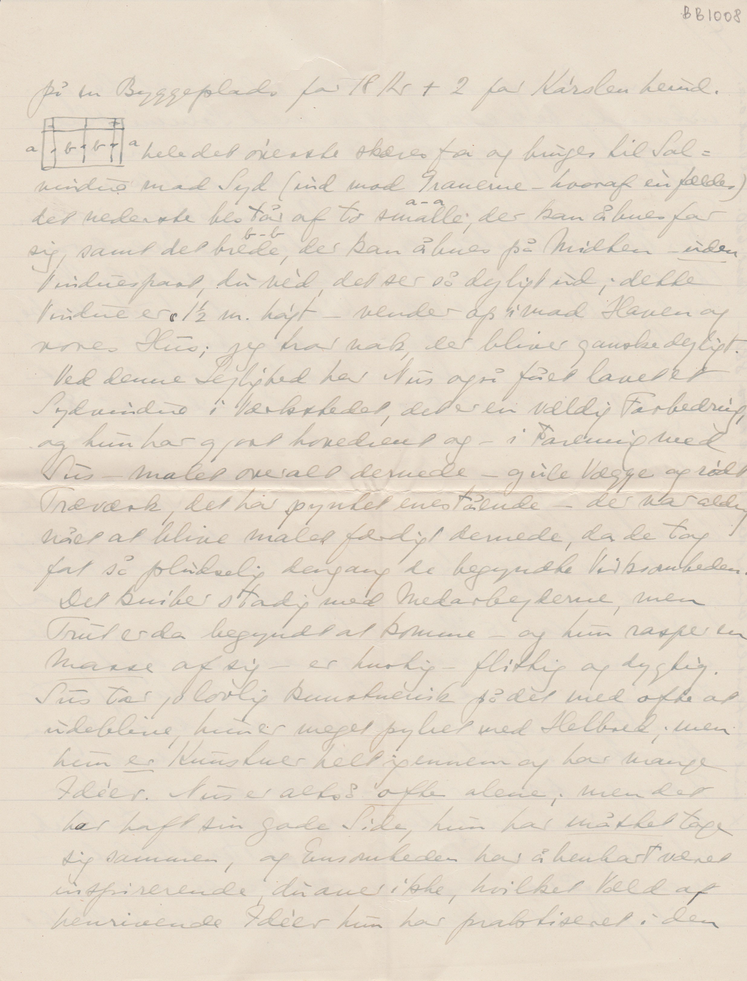 moderne Murflader, der købes hele og slides op; udvendig beklædes Væggene med Solumitplader – denne nye Byggemåde er varmere end kun (en Dobbeltmur!) ["en" indsat over linjen] og anerkendt af Myndighederne. Tegningen er godkendt af Bygningskommissionen. Der bliver fritstående Skorsten, og Brændeovn (helt moderne); det hele bliver som et lille Hus med 2 Rum og et lille Køkken; du husker måske, at Palæet ender i et lille Lukaf, hvor der stod en Seng o s v. Vi har haft Tilbud på Arbejdet x et på 625. – èt på 500 og nu det sidste på 380. – dèt tog vi, - de var her i Aftes sammen med Arkitekten, en ung 21årig Tømrersvend, som ”er begyndt for sig selv” - ! – han har som Svendestykke lavet en indvendig Trappe, som netop viser sig at passe i Tegningen - som Trappe fra Palæet og ned til den nye – kæmpestore – Stue; den køber vi for 15 Kroner! Mureren er en ganske ung, men af de andre garanteret dygtig Lærling, en Mand herude anbefalede ham, de to unge Fyre laver så det hele - men da Lærlingen kun kan i Fritiden, vil September nok gå. I Morgen kommer gamle Albertsen og fælder de fornødne Træer; desværre ryger en stor Birk, en Ædelgran, et Elmetræ og et stort Æbletræ – men så får hun også overvældende med Lys – i Dag kom et Kæmpevindue, som Axel har købt på en Byggeplads for 18 Kr + 2 for Kørslen herud [Tegning] hele det øverste skæres fra og bruges til Solvindue mod Syd (ind mod Granerne – hvoraf èn fældes) det nederste består af to smalle a - a [”a - a” indsat over linjen], der kan åbnes for sig, samt det brede b - b [”b - b” indsat over linjen] der kan åbnes på Midten – uden Vinduespost, du vèd, det ser så dejligt ud; dette Vindue er c 1 ½ M. højt – vender op imod Haven og vores Hus; jeg tror nok, det bliver ganske dejligt. Ved denne Lejlighed har Nus også fået lavet et Sydvindue i Værkstedet, det er en vældig Forbedring; og hun har gjort hovedrent og – i Forening med Sus – malet overalt dernede – gule Vægge og rødt Træværk, det har pyntet enestående – der var aldrig nået at blive malet færdigt dernede, da de tog fat så pludselig dengang de begyndte Virksomheden. Det kniber stadig med Medarbejderne, men Trut er da begyndt at komme – og hun rasper en Masse af sig – er hurtig – flittig og dygtig. Sus tar jo lovlig kunstnerisk på det med ofte at udeblive, hun er meget pylret med Helbred; men hun er Kunstner helt igennem og har mange Idèer. Nus er altså ofte alene; men det har haft sin gode Side, hun har måttet tage sig sammen, og Ensomheden har åbenbart været inspirerende, du aner ikke, hvilket Væld af henrivende Idéer hun har praktiseret i den