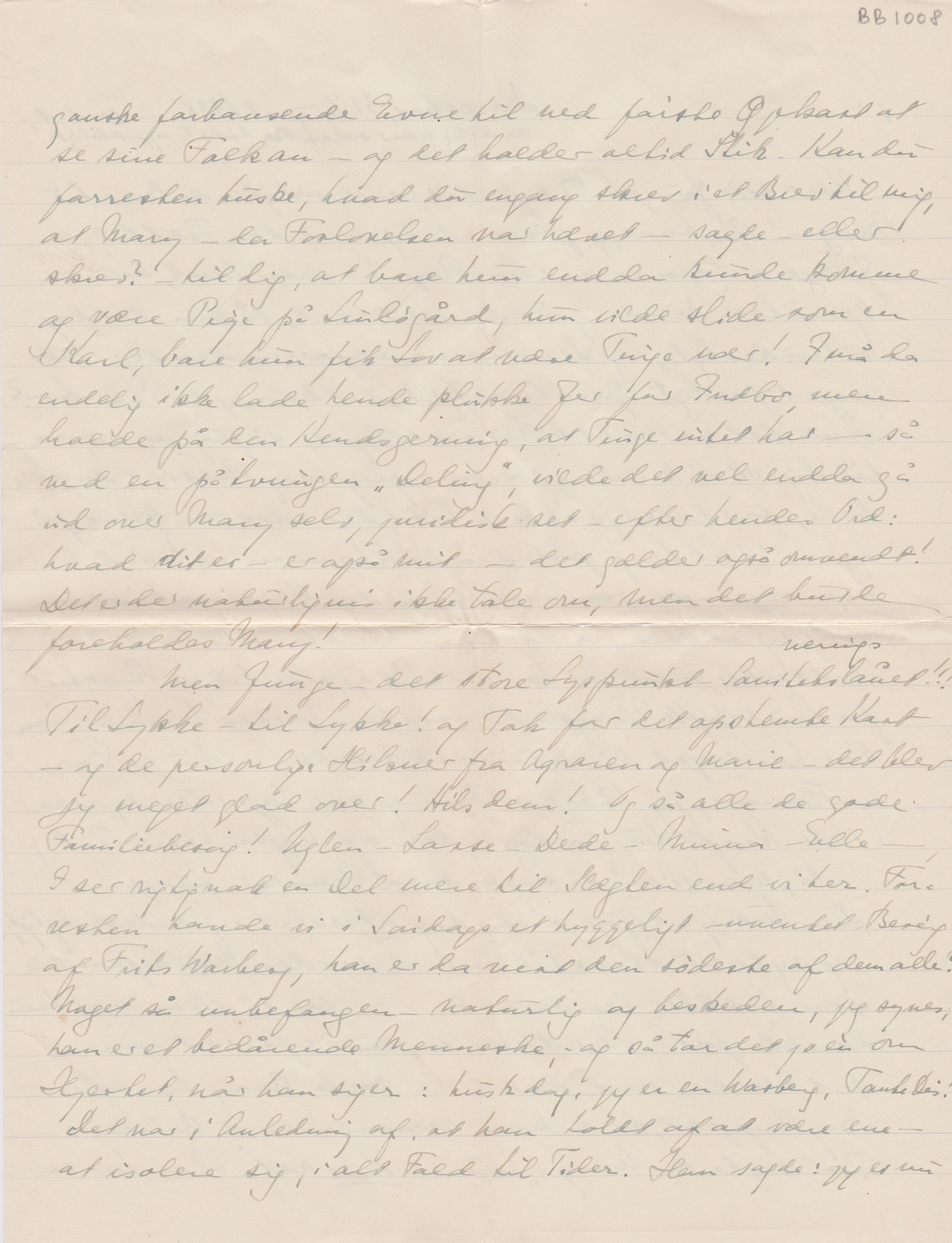 Men Junge – det store Lyspunkt Sanitetsmeningslånet!!! [”menings” indsat over linjen] Til Lykke – til Lykke! og Tak for det opstemte Kort – og de personlige Hilsener fra Agraren og Marie – det blev jeg meget glad over! Hils dem! Og så alle de gode Familiebesøg! Uglen – Lasse - Dede – Minna – Elle - , I ser rigtignok en Del mere til Slægten end vi her. Forresten havde vi i Lørdags et hyggeligt uventet Besøg af Frits Warberg, han er da vist den sødeste af dem alle? Noget så unbefangen – naturlig og beskeden, jeg synes, han er et bedårende Menneske, - og så tager det jo èn om Hjertet, når han siger: husk dog, jeg er en Warberg, Tante Dis!