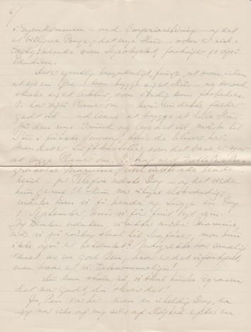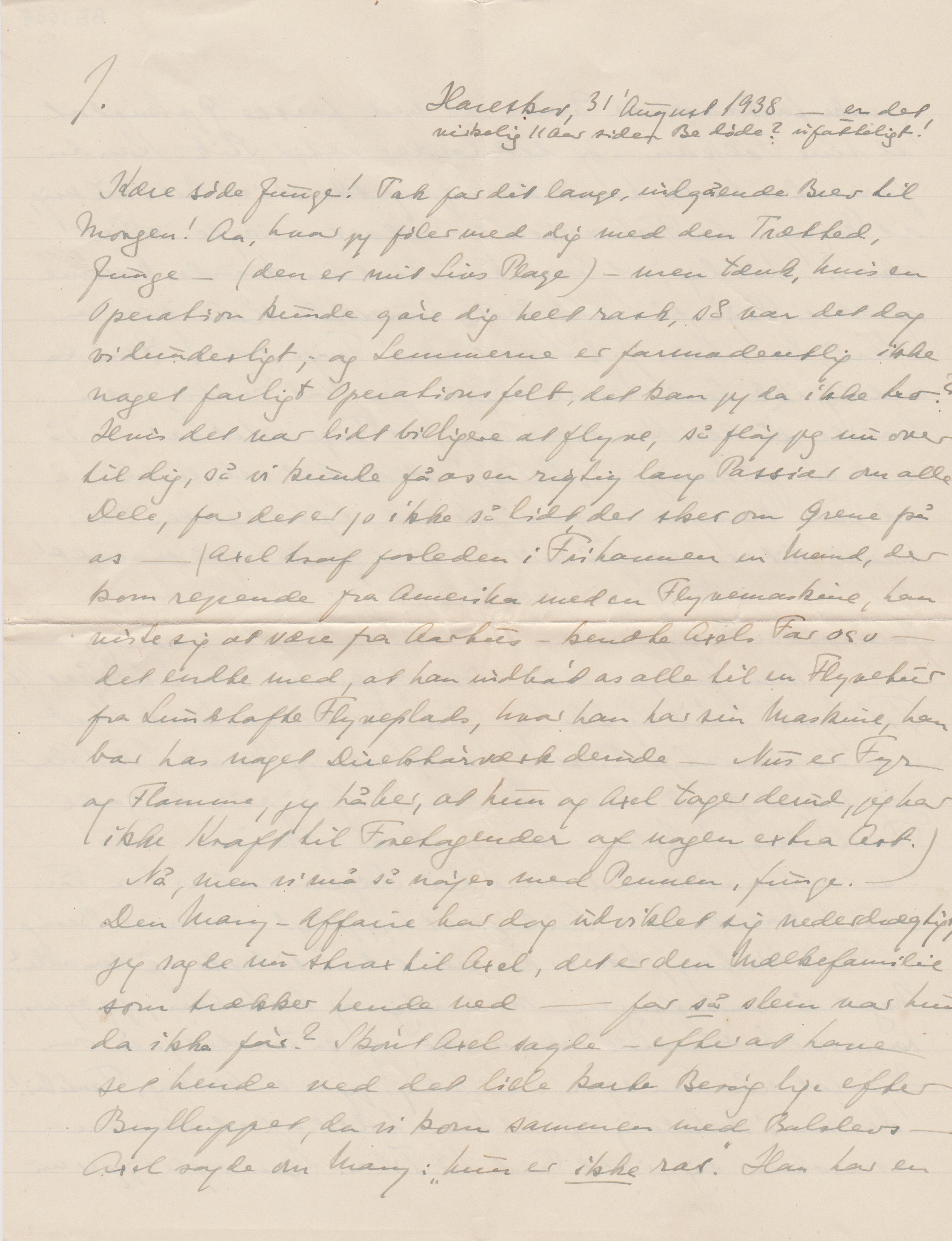 Kære søde Junge! Tak for dit lange, indgående Brev til Morgen! Aa, hvor jeg føler med dig med den Træthed, Junge – (den er mit Livs Plage) – men tænk, hvis en Operation kunde gøre dig rask, så var det dog vidunderligt; og Lemmerne er formodentlig ikke noget farligt Operationsfelt, det kan jeg da ikke tro? Hvis det var lidt billigere at flyve, så fløj jeg nu over til dig, så vi kunde få en rigtig lang Passiar om alle Dele, for det er jo ikke så lidt, der sker om Ørerne på os – (Axel traf forleden i Frihavnen en Mand, der kom rejsende fra Amerika med en Flyvemaskine, han viste sig at være fra Aarhus – kendte Axels Far osv. - det endte med, at han indbød os alle til en Flyvetur fra Lundtofte Flyveplads, hvor han har sin Maskine, han bor hos noget Direktørværk derude – Nus er Fyr og Flamme, jeg håber, at hun og Axel tager derud, jeg har ikke Kraft til Foretagender af nogen extra Art.)