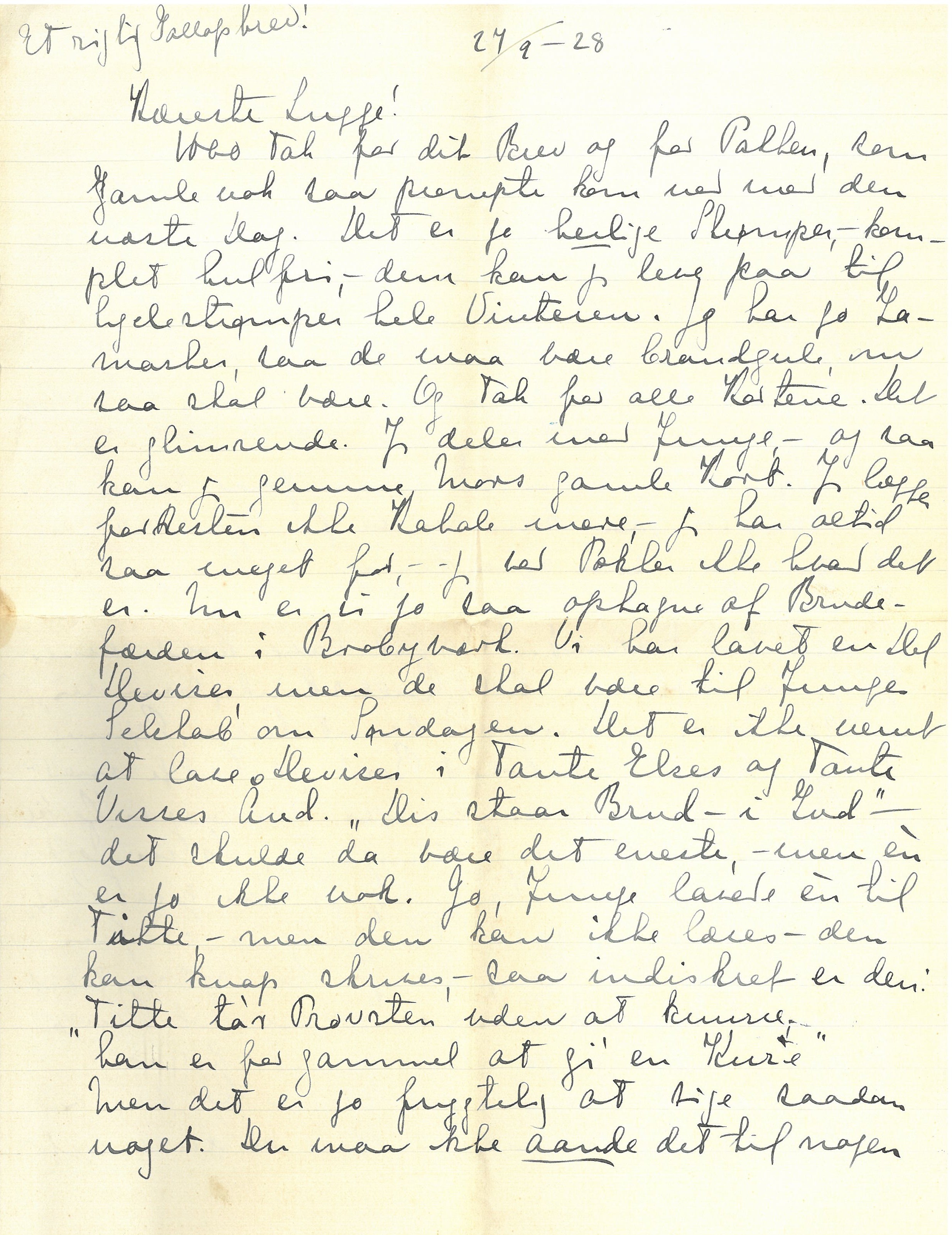 1000 Tak for dit Brev og for Pakken, som Gamle nok saa prompte kom ned med den næste Dag. Det er jo herlige Strømper, - komplet hulfri, - dem kan jeg hænge paa til Cyclestrømper hele Vinteren. Jeg har jo Gamasker, saa de maa være Brandgule, om saa skal være. Og Tak for alle Kortene. Det er glimrende. Jeg deler med Junge, - og saa kan jeg gemme Mors gamle Kort. Jeg lægger forresten ikke Kabale mere, - jeg har altid saa meget for, - - jeg ved Pokker ikke hvad det er. Nu er vi jo saa optagne af Brudefærden i Brobyværk. Vi har lavet en Del Deviser, men de skal være til Junges Selskab Selskab om Søndagen. Det er ikke nemt at lave Deviser i Tante Elses og Tante Visses Ånd. "Dis staar Brud - i Gud" - det skulde da være det eneste, men èn er jo ikke nok. Jo, Junge lavede èn til Titte, - men den kan ikke læses - den kan knap skrives, saa indiskret er den! "Titte ta'r Provsten uden at knurre;