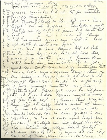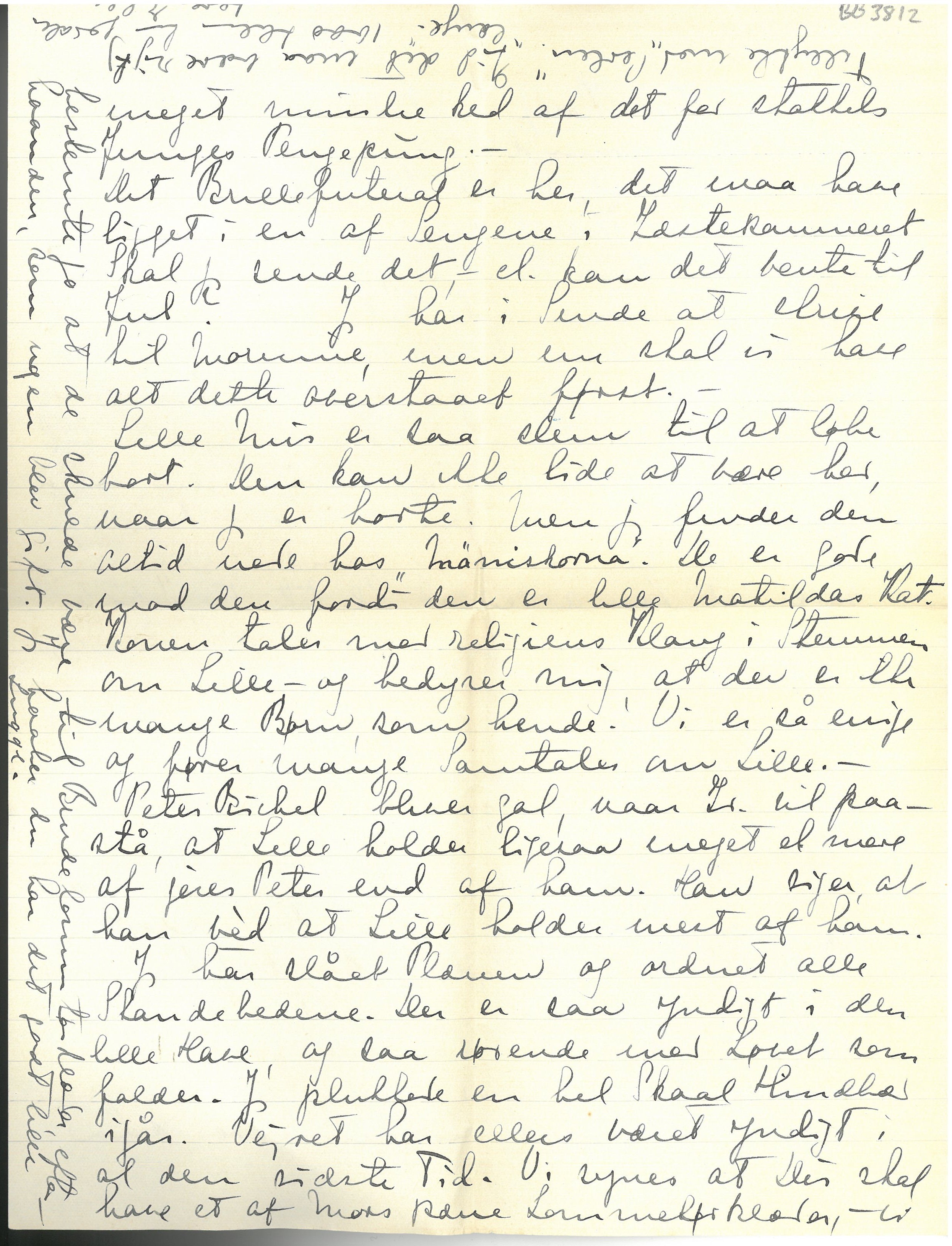 Jeg har slået Plænen og ordnet alle Staudebedene. Der er saa yndigt i den lille Have, og saa rørende med Løvet som falder. Jeg plukkede en hel Skaal Hindbær igår. Vejret har ellers været yndigt i al den sidste Tid. Vi synes at Dis skal have et af Mors pæne Lommetørklæder, - vi [teksten fortsætter i venstre margen s. 4; lodret:] bestemte jo at de skulde være til Brudelommetørklæder, efterhaanden, som nogen blev gift. Jeg haaber du har det godt lille Lugge.