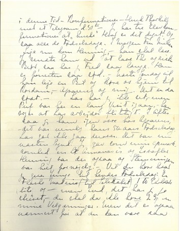 Men det er jo frygtelig at sige saadan noget. Du maa ikke aande det til nogen Junge er saa oplivet over alt dette. Hun har lavet 2 nydelige Sange, - èn alvorlig og en sjov. De Parret ["Parret" indsat over linjen] kommer jo i Morgen Aften og skal logere her. Det lille Gæstekams staar og skinner af Renlighed. Saa kører vi Lørdag Morgen derned. Vielsen er Klk 11, saa Frokosten. Saa skal vi jo hjem igen. Jeg er bange at Dis vil til Erikshaab. Du hørte, hvad Pallam sagde, - jeg er sikker paa, at han ikke ["ikke" indsat over linjen] bliver begejstret. Men det maa gaa som det kan. - Saa kommer vi jo hjem og er sultne, - saa giver Junge Aftensmad Om Søndagen har vi Agrarens og Brudeparret til Frokost. Vi skal have kold Skinke. (Jeg har købt en halv Rulleskinke, som den du gav mig i Sommer). samt Purrer, Bønner, Blomkaal o.s.v. Saa koldt Bord og Kaffe med Bagværk. Bajere. Junges Middag af er Klk 1/2 6 Blomkaalssuppe. Kyllingesteg, Is m. Jordbærmarmelade. Konfekt. Jeg har givet hende i Fødselsdagsgave 1 Fl. Madeira og fin Chokolade til Konfekt. Jeg har ogsaa givet hende* "Edith 2 Timer" i Morgen til Rengøring. Det er jo ikke nemt for os at faa noget lavet med Elever og "saa ved det" at det er Søndag. Hvor er der meget i denne Tid - Konfirmationen - Husk Thorkild med et Telegram d. 30_te_ Jeg har tre Elevkonfirmationer at "huske" Hvor er det dyrt! Og saa alle de Fødselsdage. I Morgen Fru Nielsen. Lige nu kom Henning, - han skal læse. Jeg sendte ham ud at lave The og riste Brød, saa har jeg Fred saa længe. Han er forresten saa sød. - Næste Søndag vil han leje en Bil og køre os hjem til Rørdam, - Agrarens og mig. - Det er da sødt. - Las har jeg ikke set, - men Puf var her en lang Visit igaar, - han siger at Las arbejder flittigt. I Aftes saa jeg ham igen ovre hos Agrarens, - det var nemlig hans 50-aars Fødselsdag. Las gad ikke gaa derover. Det var nu næsten Synd. Jeg gav som min Opmærksomhed en Lt. Annanasis og Isvafler. Henning var der ogsaa og Stemningen var helt fornøjelig. - Vil du høre hvad jeg giver Junge til hendes Fødselsdag: En Flaske Madeira (til Selskabet) 1 Pund Chokolade (dito) og - men Gud, det har jeg jo skrevet, - [overstregning fra "jeg giver" til og med "1 Pund"] du skal da ikke høre 2 Gg. om mine Velgærninger. Men det er ogsaa nærmest for at du kan være saa meget mindre ked af det for stakkels Junges Pengepung. -