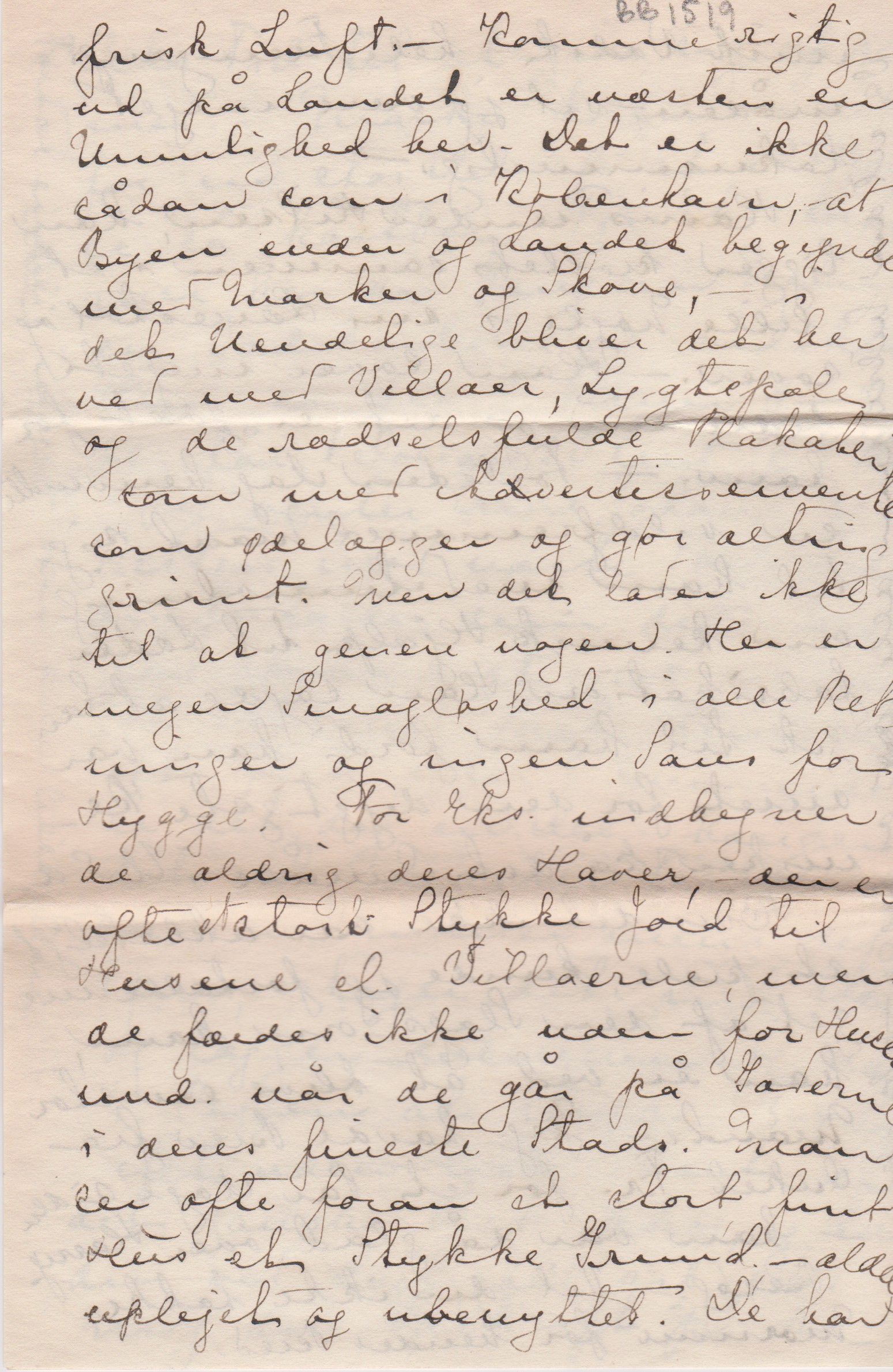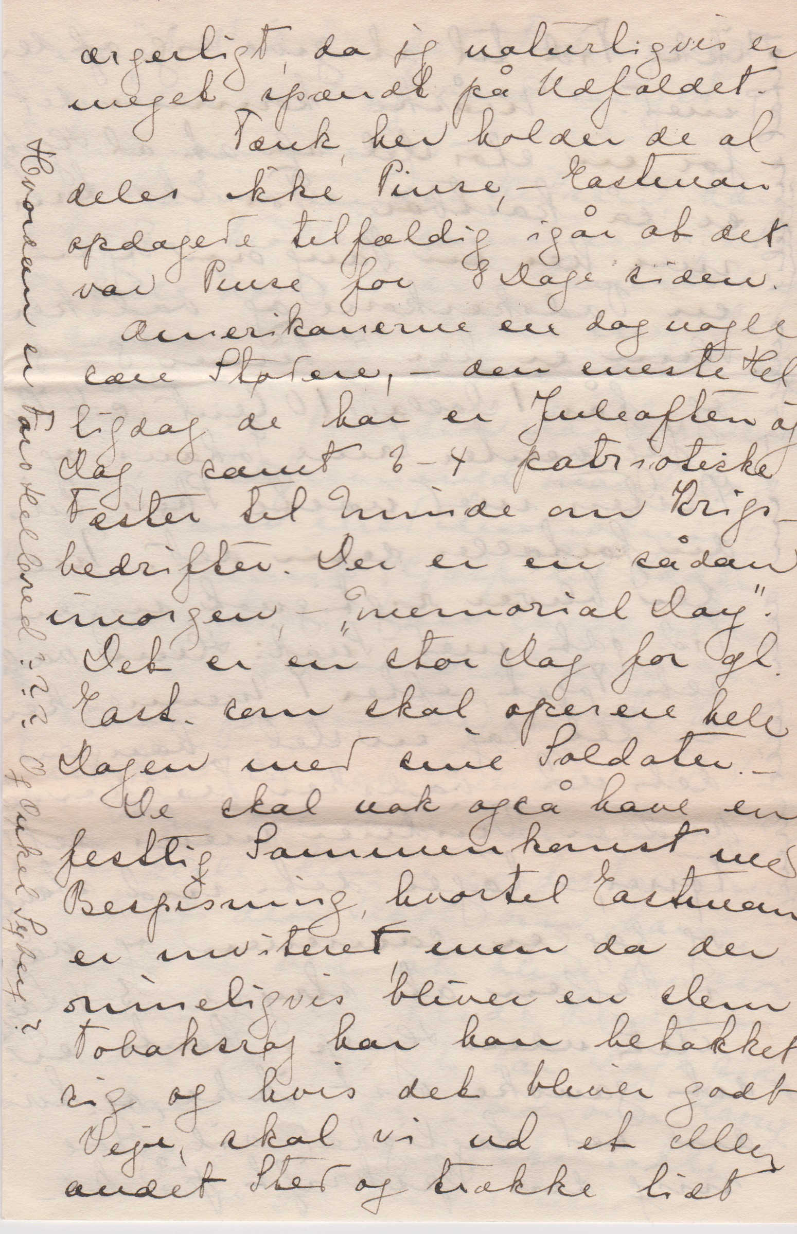 Amerikanerne er dog nogle sære Stødere, - den eneste Helligdag de har er Juleaften og Dag samt 2-4 patriotiske Fester til Minde om Krigsbedrifter. Der er en sådan imorgen, - ”Memorial Day”. Det er en stor Dag for gl. East. som skal operere hele Dagen med sine Soldater. De skal nok også have en festlig Sammenkomst med Bespisning, hvortil Eastman er inviteret, men da der rimeligvis bliver en slem Tobaksrøg har han betakket sig og hvis det bliver godt Vejr skal vi ud et eller andet Sted og trække lidt frisk Luft. – Komme rigtig ud på Landet er næsten en Umulighed her – Det er ikke sådan som i København, at Byen ender og Landet begynder med Marker og Skove, - det Uendelige bliver det herved med Villaer, Lygtepæle og de rædselsfulde Plakater som med Advertissementer som ødelægger og gør alting grimt. Men det lader ikke til at genere nogen. Her er megen Smagløshed i alle Retninger og ingen Sans for Hygge. For Eks. indhegner de aldrig deres Haver, - der er ofte et stort Stykke Jord til Husene el. Villaerne, men de færdes ikke uden for Husene und. når de går på Gaderne i deres fineste Stads. Man ser ofte foran et stort fint Hus et Stykke Grund – aldeles uplejet og ubenyttet. De har ikke Tid til at give sig af dermed. – Måske kommer det for en stor Del af at Hjælp er så kostbar. For Eks. kommer der her en Gang om Ugen en Vadskekone og vadsker. Hun er her 7 Timer, 8-3 og får 1 Dollar 10 Cent (e. 4 Kr.) Jeg venter Trine Johans og Resten med næste Skib hvis du fortæller dem det. Men der bliver rigtignok ingen Tid ødt med Snak: Hun vadsker alt Tøjet, efter 7 Mennesker er det dog en Del – hænger det ud, vadsker Trappen eller pudser Vinduer mens det tørrer, – tager det ind, stænker og lægger sammen og når i Reglen at stryge helt uden Hjælp. Rent er det ganske vist ikke, og hvis du ved Lejlighed vil give mig din Opskrift på kemisk Vadsk – hele Fremgangsmåden – vil jeg være meget taknemmelig. –