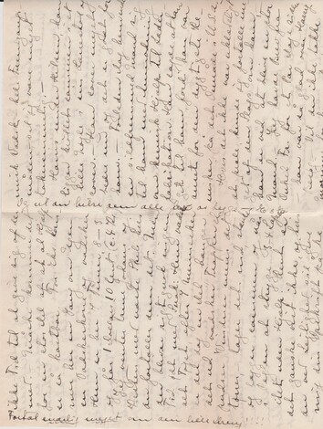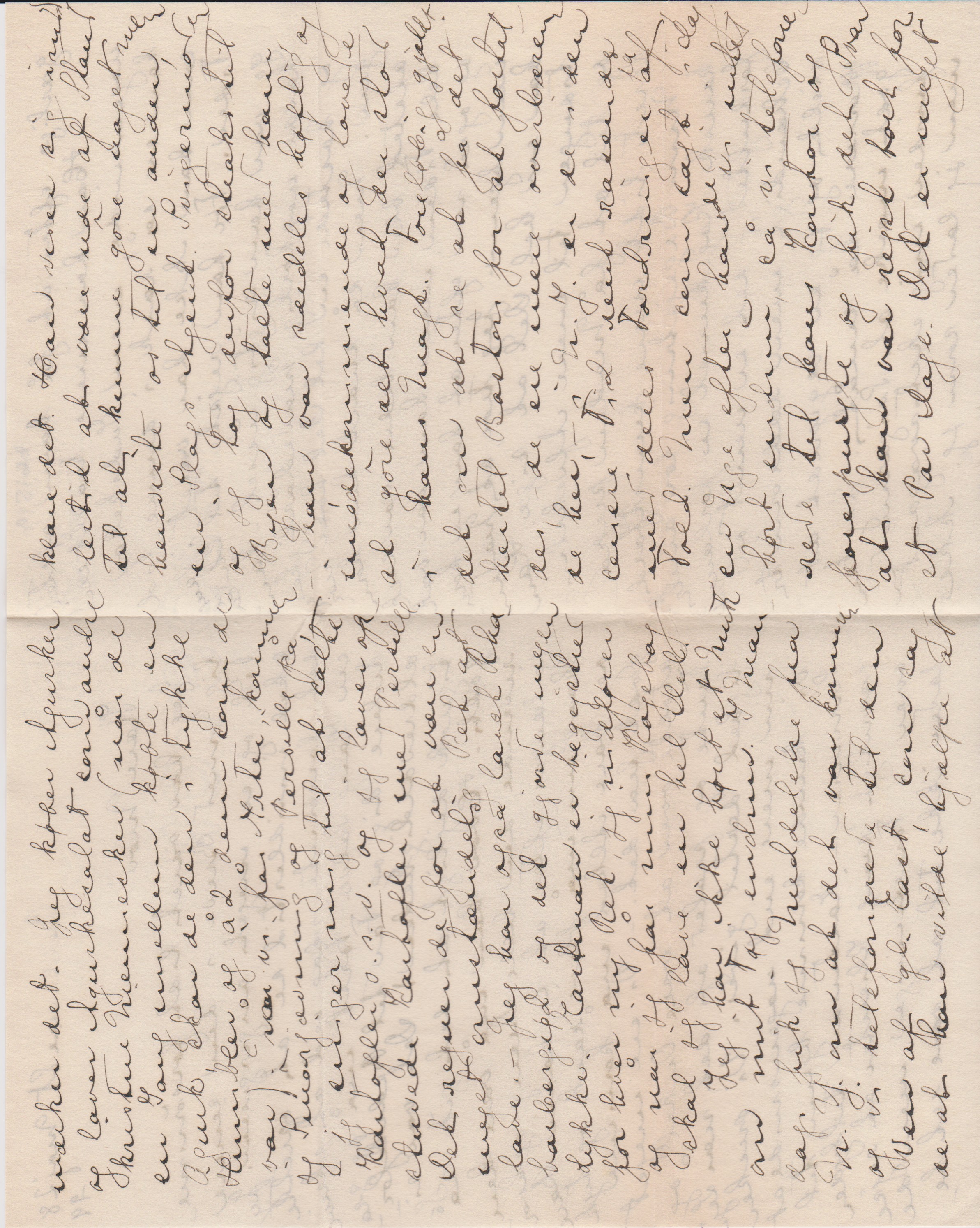 Jeg har været lidt forsømmelig med Breve i den senere Tid og er meget angergiven. Jeg skal imidlertid se at oprette det forsømte idag ved at skrive en lang Salve. Først må jeg gratulere dig og Far til Bedsteforældreværdigheden! Det var rigtignok dejligt at det gik så godt. Hvor han må være henrivende, den lille Dreng og hvor jeg længes efter atbare se ham. Bare han nu må blive rask og tyk og bare Alhed må komme godt fra det. - Vi ere meget stolte over at være Onkel og Tante og praler af det, når Lejlighed dertil gives. Vi ønsker nu mere end nogensinde at vi kunde komme hjem til Sommer, - Eastman tilbyder jævnligt sine Klienter at rejse over i Forretninger, men de lader ikke til at være ret begærlige efter at få ham afsted.