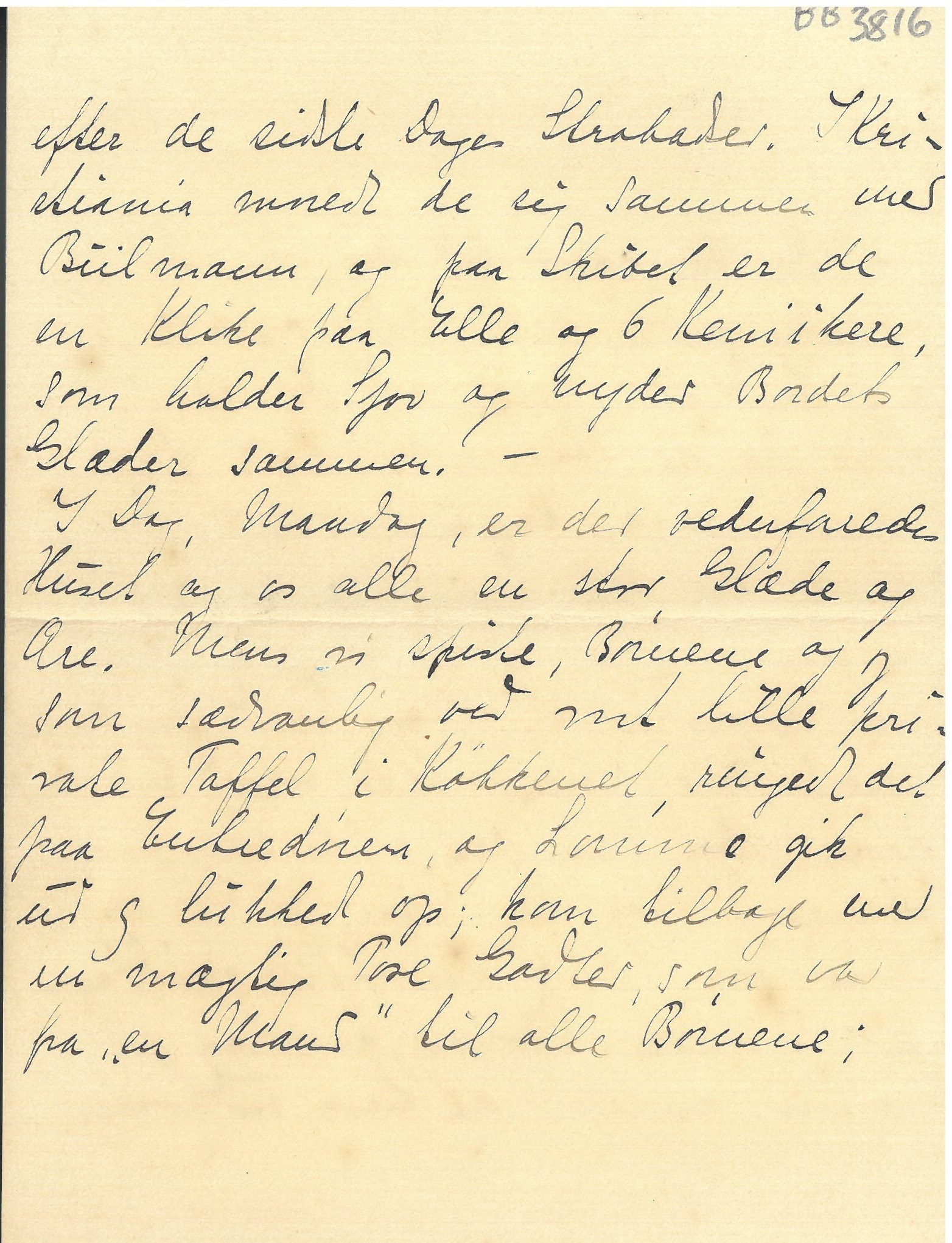 I Dag, Mandag, er der vederfaredes Huset og os alle en stor Glæde og Ære. Mens vi spiste, Børnene og jeg som sædvanlig ved mit lille private Taffel i Køkkenet, ringede det paa Entredøren, og Lomme gik ud og lukkede op; kom tilbage med en mægtig Pose Godter, som var fra "en Mand" til alle Børnene;