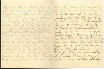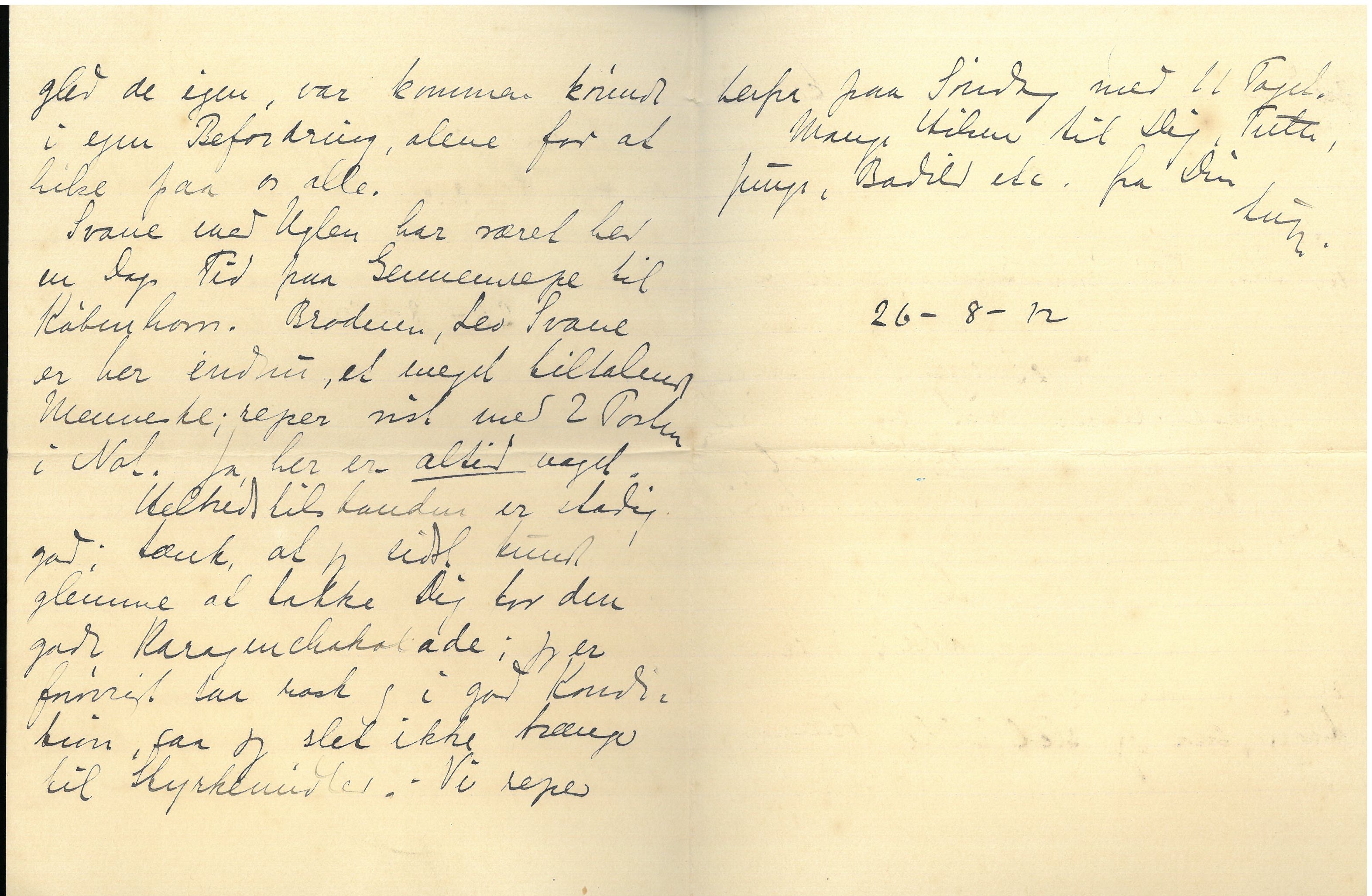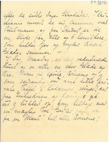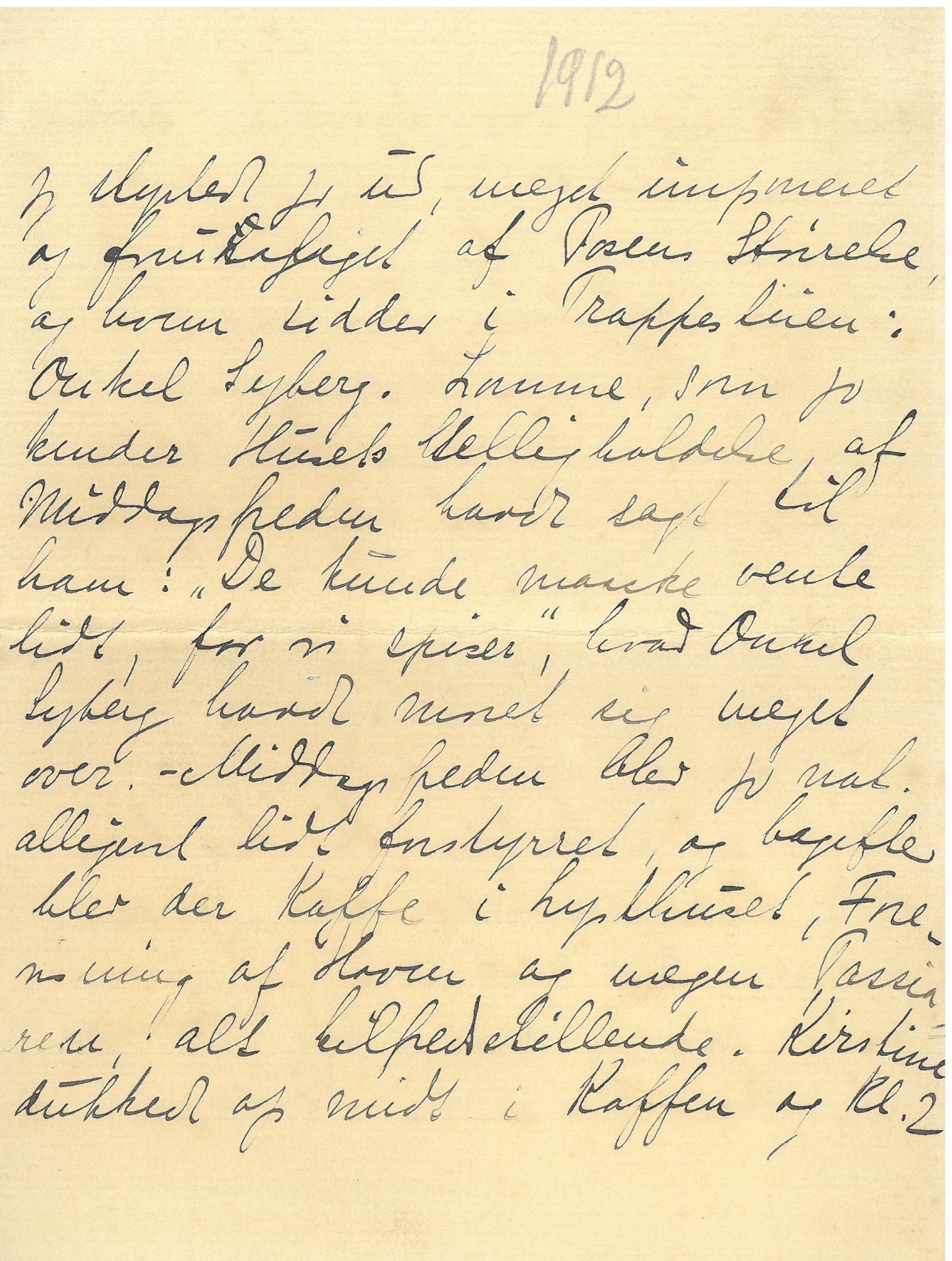 [Herefter med blæk:] jeg styrtede jo ud, meget imponeret og foruroliget af Posens Størrelse, og hvem sidder i Trappestuen: Onkel Syberg. Lomme, som jo kender Husets Helligholdelse af Middagsfreden havde sagt til ham: "De kunde maaske vente lidt, for vi spiser", hvad Onkel Syberg havde moret sig meget over. - Middagsfreden blev jo nok alligevel lidt forstyrret, og bagefter blev der Kaffe i Lysthuset, Fremvisning af Haven og megen Passiaren; alt tilfredsstillende. Kirstine dukkede op midt i Kaffen og Kl. 2 gled de igen, var kommen kørende i egen Befordring, alene for at hilse paa os alle.