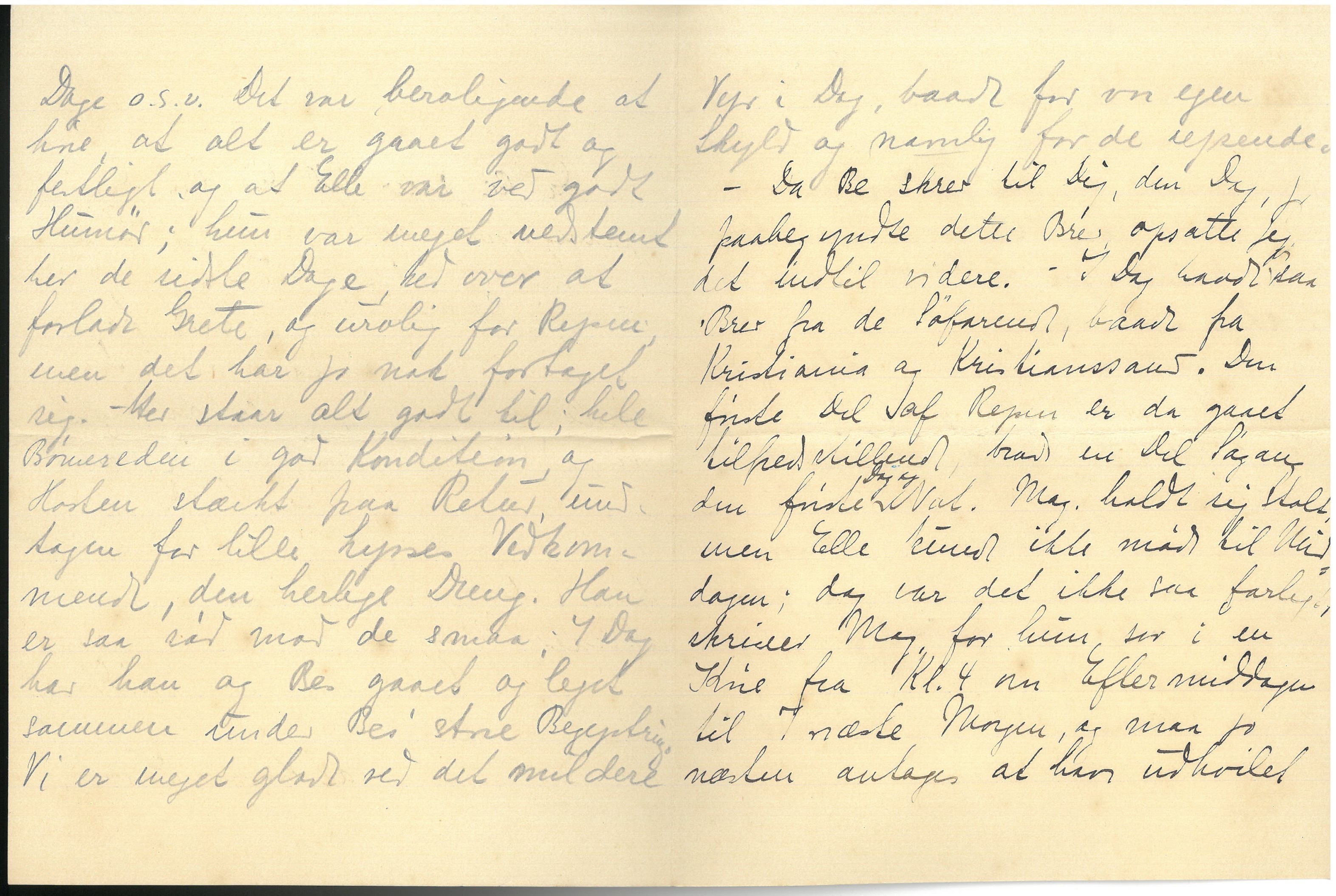 1000 Tak for det lange interessante Brev til Alhed i Dag, som ogsaa jeg har nydt godt af; hvor det er dejligt, at det gaar saa godt; mon ikke denne radikale Kur skulde faa konstante Virkninger paa "det slemme, haardnakkede Ben". Det er meget karakteristisk, at det er Dig, hospitalsbundne, der forsyner os med Efterretninger fra Afrejsen, de sidste Dage o.s.v. Det var beroligende at høre, at alt er gaaet godt og festligt og at Elle var ved godt Humør; hun var meget nedstemt her de sidste Dage; ked over at forlade Grete, og urolig for Rejsen; men det har jo nok fortaget sig. - Her staar alt godt til; hele Børnereden i god Kondition, og Hosten stærkt paa Retur, undtagen for lille Lysses Vedkommende, den herlige Dreng. Han er saa sød mod de smaa; I Dag har han og Bes gaaet og leget sammen under Bes' store Begejstring. Vi er meget glade ved det mildere Vejr i Dag, baade for vor egen Skyld og navnlig for de rejsende. Da Be skrev til dig, den Dag, jeg paabegyndte dette Brev, opsatte jeg det indtil videre. - I Dag havde vi ["vi" indsat over linjen] saa Brev fra de Søfarende, baade fra Kristiania og Kristianssens. Den første Del af Rejsen er da gaaet tilfredsstillende, trods en Del Søgang den første Dag og ["Dag og" indsat over linjen] Nat. Mag. holdt sig stolt, men Elle kunde ikke møde til Middagen; dog var det ikke saa farligt, skriver Mag, for hun sov i en Køre fra Kl. 4 om Eftermiddagen til 7 næste Morgen, og maa jo næsten antages at hun udhvilet efter de sidste Dages Strabadser. I Kristiania fandt de sammen med Biilmann, og paa Skibet er de en Klike paa Elle og 6 Kemikere, som holder Sjov og nyder Bordets Glæder sammen. -