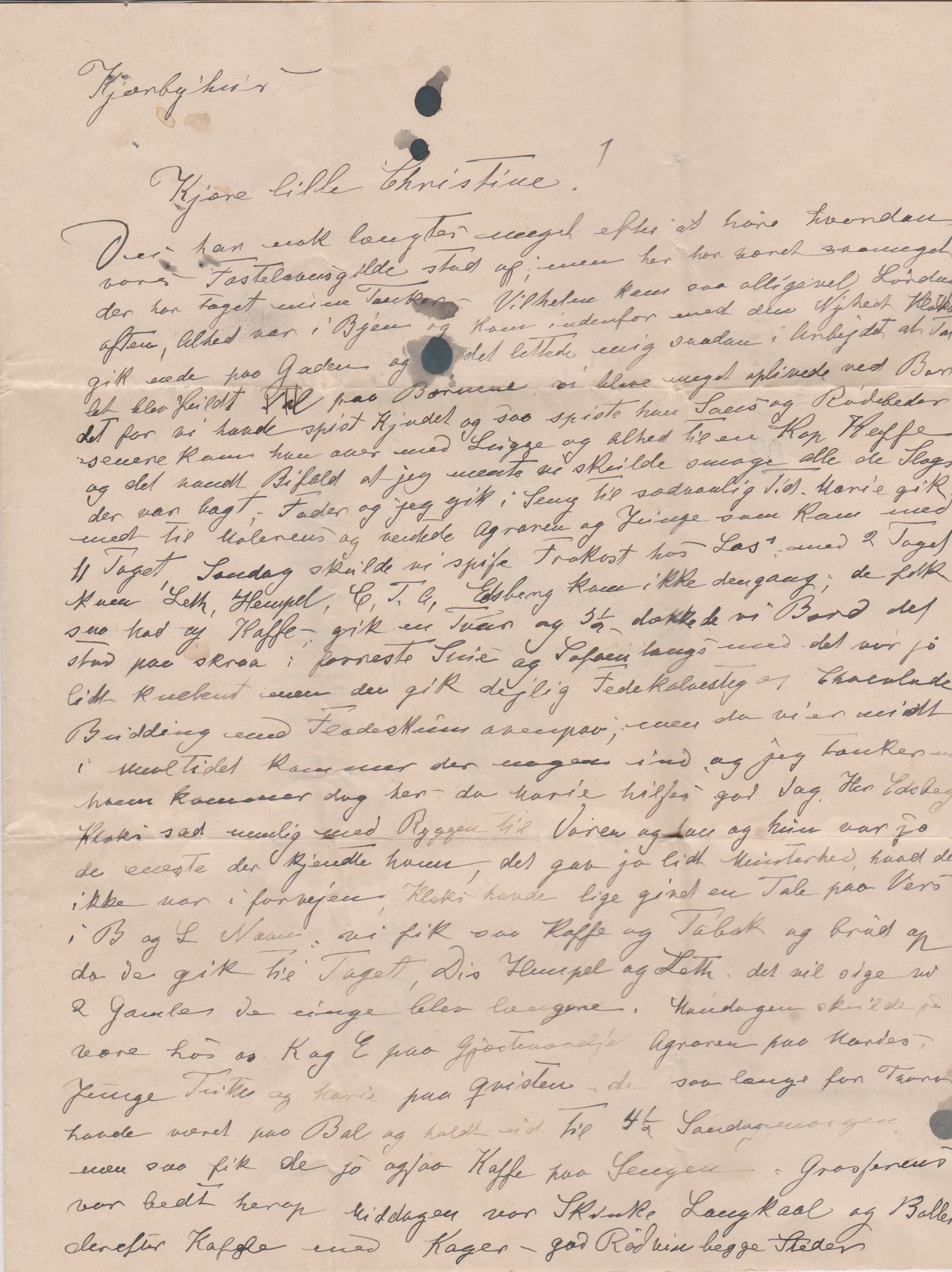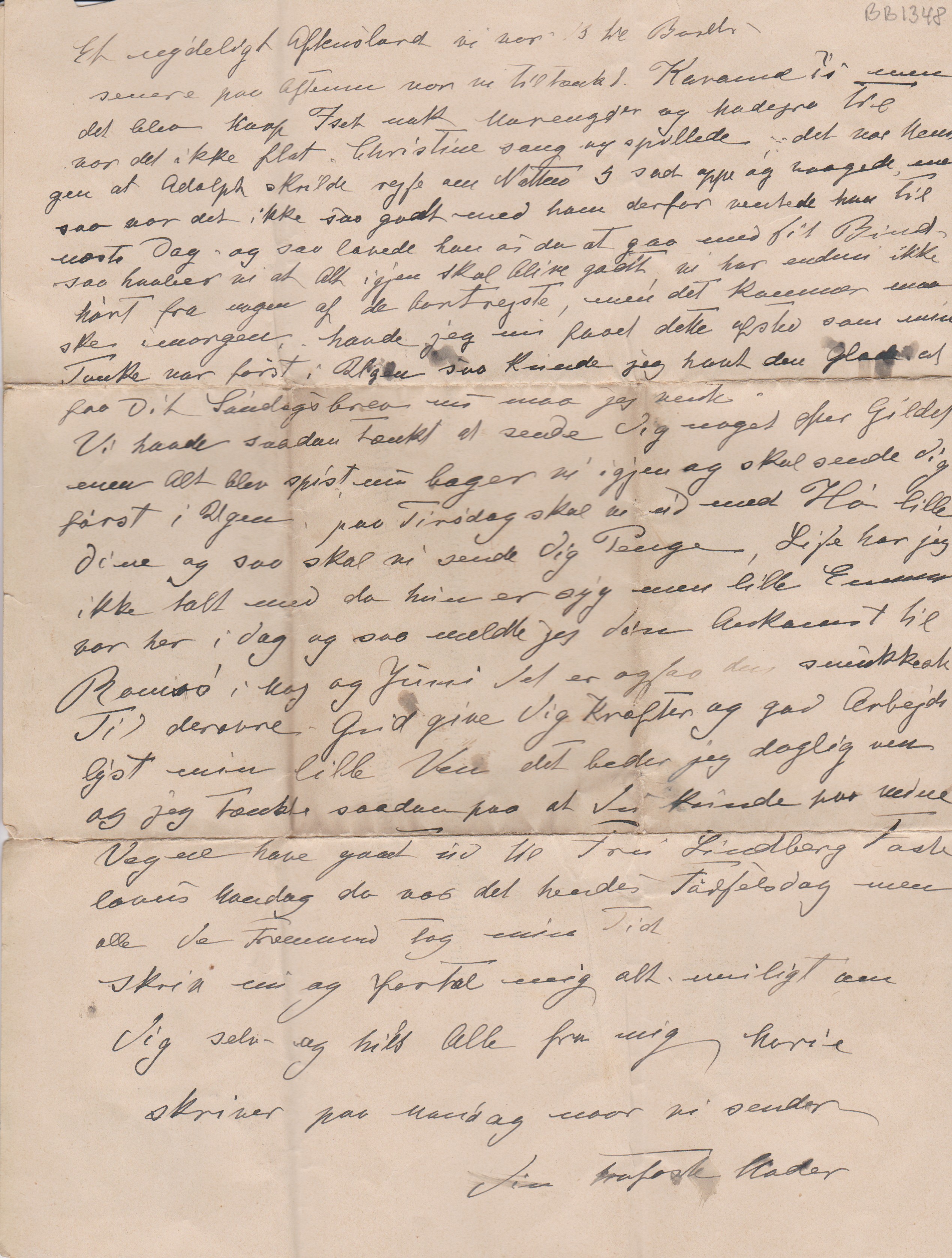 Vi havde saadan tænkt at sende Dig noget efter Gildet men alt blev spist, nu bager vi igjen og skal sende dig først i Ugen, paa Tirsdag skal vi ud med Hø lille Dine og saa skal vi sende dig Penge, Lise har jeg ikke talt med da hun er syg men lille Emma var her i Dag og så meldte jeg Din Ankomst til Romsø i Maj og Juni det er ogsaa den smukkeste Tid derovre – Gud give dig Kræfter og god Arbejdslyst min lille Ven det beder jeg daglig ved og jeg tænkte saadan paa at Du kunde paa vore Vegne have gaaet ud til Fru Lindberg Fastelavns Mandag da var det hendes Fødselsdag men alle de Fremmede tog min Tid.