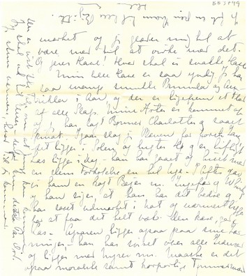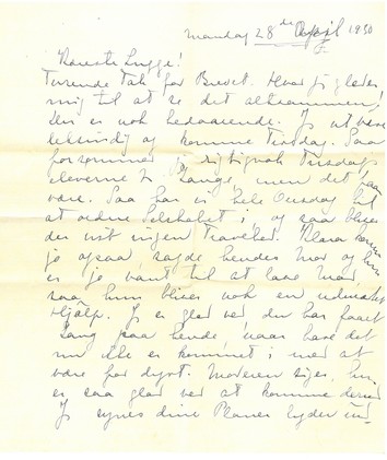 Min lille Have er saa yndig. Jeg har saa mange smukke Primula og Aurikler i Aar, og der er ligefrem et Flor af alle Slags. Mine Ærter er kommet op og jeg har lagt Bønner, Charlotter og saaet Spinat. Igaar slog jeg Plænen for første Gang - det ligger i Solen og lugter af Hø og er lifligt. Las ligger idag - han har gaaet og hivet med en slem Forkølelse en hel Uge. I Aftes gav vi ham en kogt Bajer m. Ingefær og Whisky, og han siger, at han har det bedre og har sovet udmærket i Nat og nærmest ligger for at faa det helt væk. Den kære, gode Las. Agraren ligger ogsaa paa sine Gærninger - han har sviret over alle Grænser og ligger med Nyrer nu. Maaske er det ogsaa moralske samt korporlige Tømmermænd [indsat side 2 langs venstre margen; lodret:] Der er vist ikke Tale om at Junge kan komme. Jeg skal ud til Elever - derfor kun disse Par Ord. Jeg skriver nærmere, hvad Tid jeg kommer. [Indsat øverst s. 2; på hovedet:] Jeg fik en pæn Krans til lille Birgitte. Hilsen E