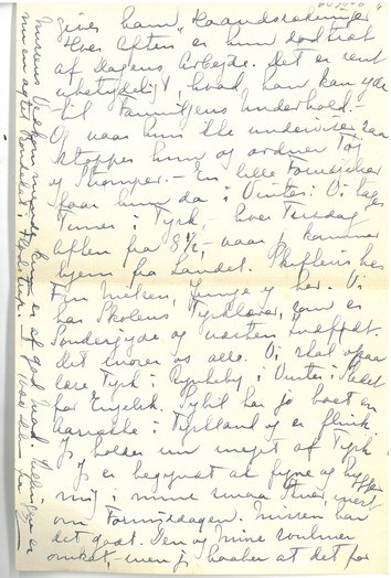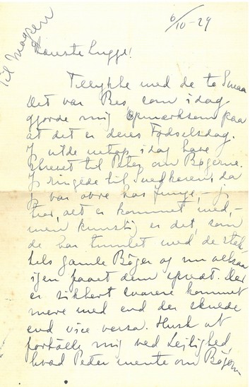 Tillykke med de to Smaa Det var Bes, som idag gjorde mig opmærksom paa at det er deres Fødselsdag. Jeg vilde netop idag have skrevet til Peter om Bøgerne. Jeg ringede til Snedkeren, da jeg var ovre hos Junge, - jeg tror, alt er kommet med, - men kunstig er det, som de har tumlet med de stakkels gamle Bøger og nu altsaa igen faaet dem spredt. Der er sikkert snarere kommet mere med end der skulde end vice versa. Husk at fortælle mig ved Lejlighed, hvad Peter mente om Bøgerne. Jeg sender dig her den lille unge Kones Adr. Hun kommer tilbage til Kbnh. næste Uge. Hun var meget glad ved Udsigten til at komme ud og sy for dig. Jeg tror hun vil kunne blive meget nyttig. Hun er saadan en ferm, dygtig lille èn. Hun syr nydeligt, men er selv meget beskeden med det og siger hun kan ikke saa meget paa egen Haand. Hun kan ogsaa hjælpe med Selskaber, hvis det skal være en Gang. -