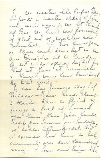 Jeg ser næsten ikke Puf og Bes - fordi jeg aldrig er hjemme. Men naar jeg ser et Glimt af Bes ser hun saa fornøjet og glad ud og snakker saa muntert. Jeg tror hun gaar og bliver rask der. Det er en ren Fornøjelse at se hende. Og det er da ogsaa dejligt for Puf at have et Menneske i Huset, som han kan snakke lidt med. -