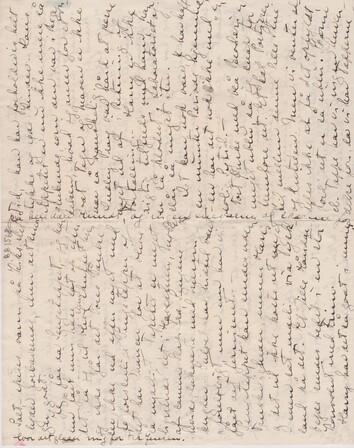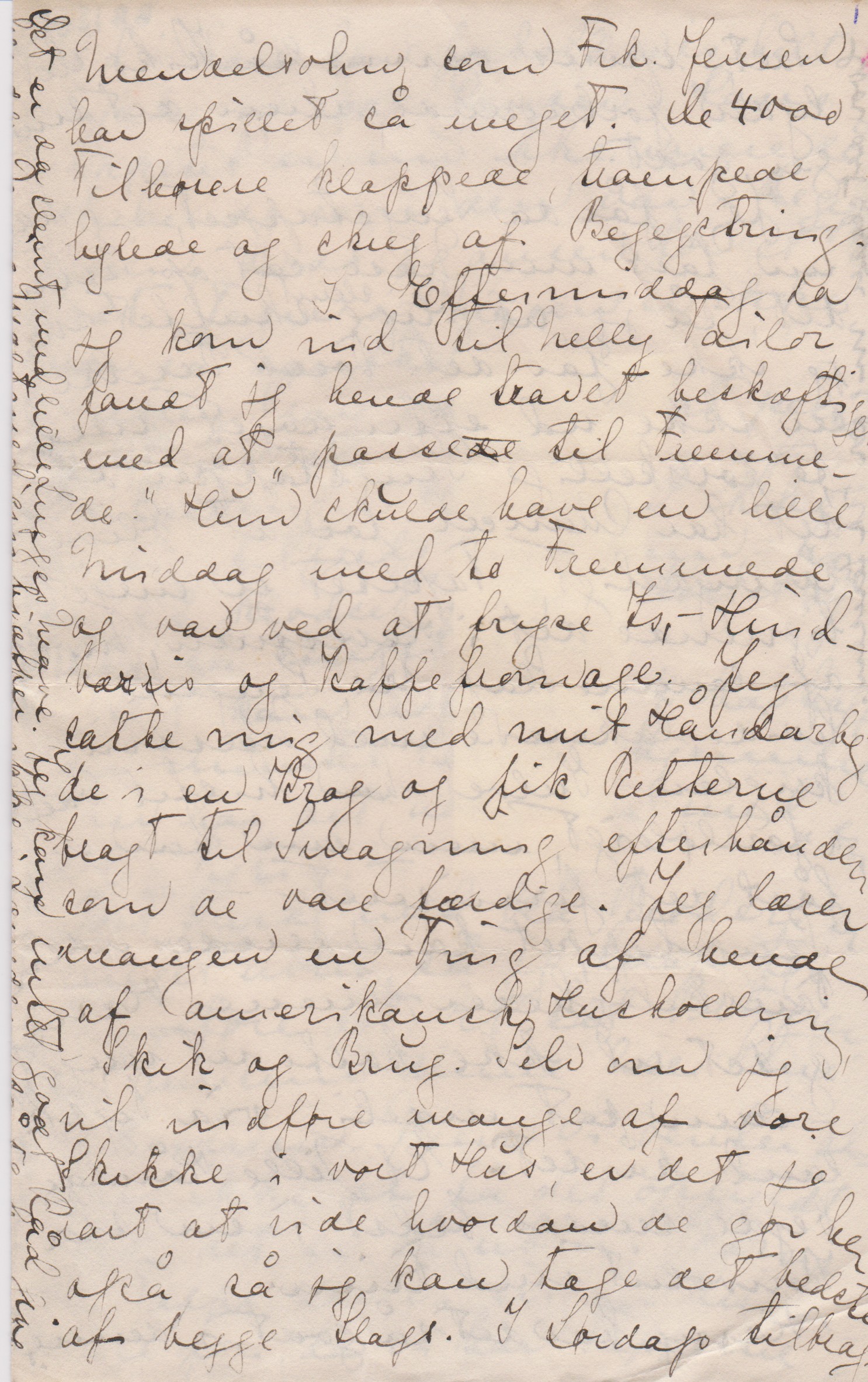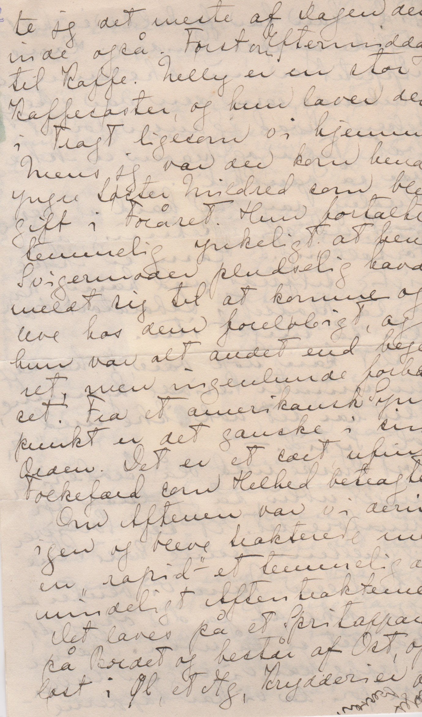 – I Eftermiddag, da jeg kom ind til Nelly Tailor, fandt jeg hende travlt beskæftiget med at ”passede til Fremmede”. ["d'et" i "passede" overstreget] Hun skulde have en lille Middag med to Fremmede og var ved at fryse Is, - Hindbæris og Kaffefromage. Jeg satte mig med mit Håndarbejde i en Krog og fik Retterne bragt til Smagning efterhånden som de vare færdige. Jeg lærer mangen en Ting af hende af amerikansk Husholdning, Skik og Brug. Selv om jeg vil indføre mange af vore Skikke i vort Hus, er det jo rart at vide hvordan de gør her også, så jeg kan tage det bedste af begge Slags. I Lørdags tilbragte jeg det meste af Dagen derinde også. Først om Eftermiddagen til Kaffe. Nelly er en stor Kaffesøster, og hun laver den i Tragt ligesom vi hjemme. Mens jeg var der kom hendes yngre Søster Mildred som blev gift i Foråret. Hun fortalte temmelig ynkelig at hendes Svigermoder pludselig havde meldt sig til at komme og leve hos dem foreløbigt, og hun var alt andet end begejstret, men ingenlunde forbavset. Fra et amerikansk Synspunkt er det ganske i sin Orden. Det er et sært ufint Folkefærd som Helhed betragtet.