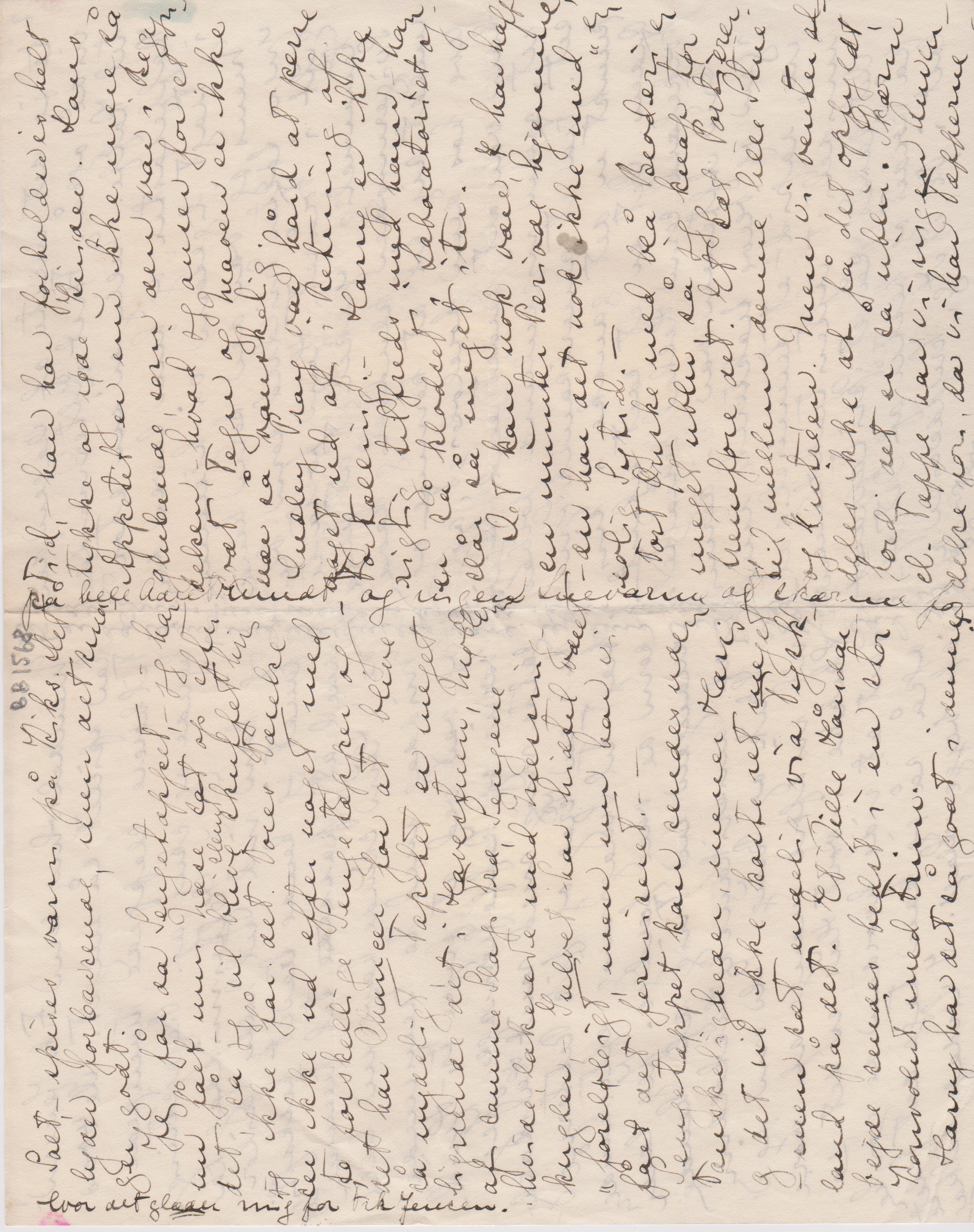 Jeg får da Sengetæppet, - jeg har nu fået sat min Næse op efter det, så jeg vil blive slem [”slem” indsat over linjen] skuffet hvis jeg ikke får det. Vores Værelse ser ikke ud efter noget med to forskellige Sengetæpper og det har Chancen for at blive så nydeligt, Tapetet er meget lignende det i Havestuen, Møblerne af samme Slags Træ, Sengene hvide, lakerede med Messingkugler, - Gulvet har hidtil været ”foreløbigt,” men nu har vi fået det ferniseret. - -