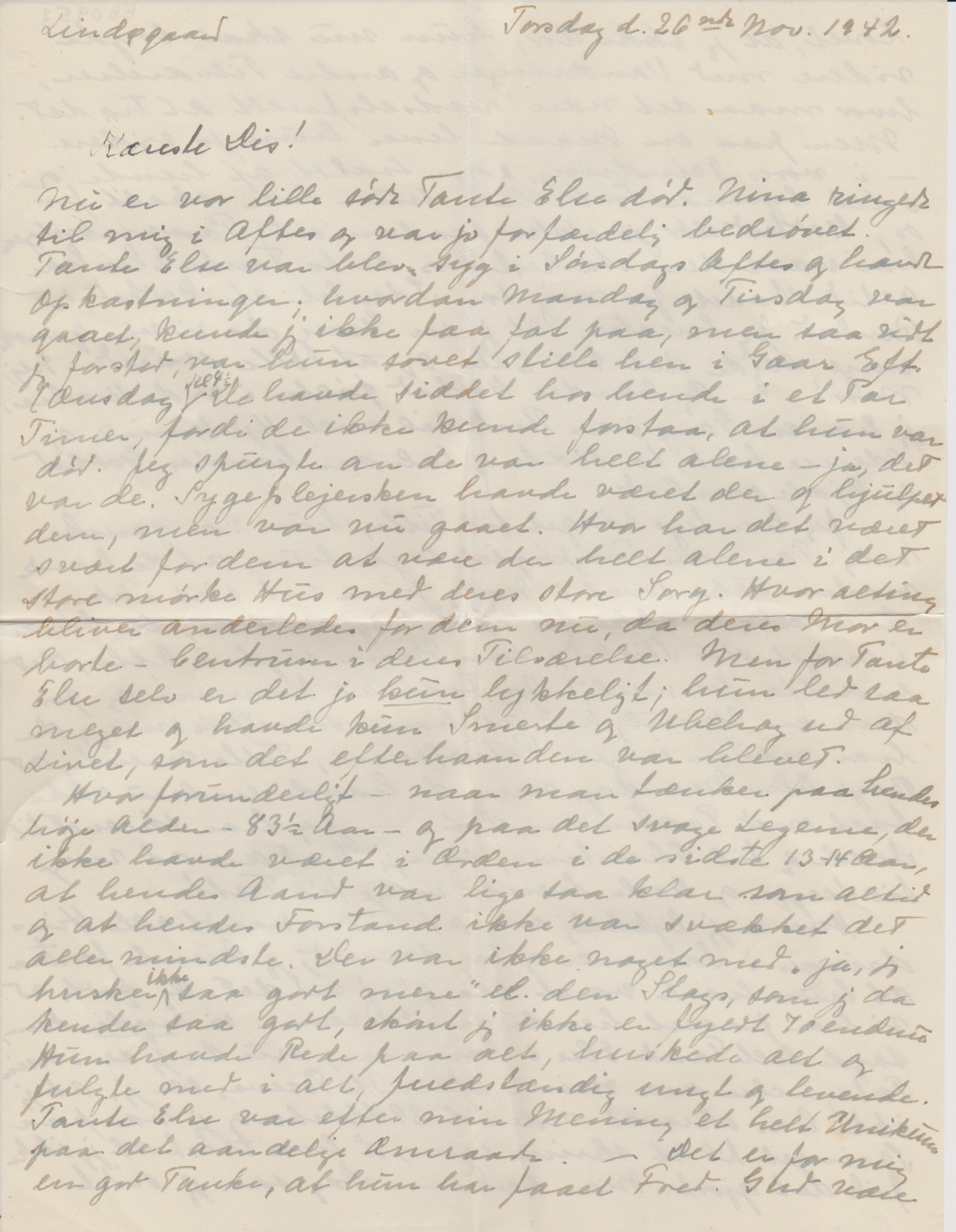 Nu er vor lille søde Tante Else død. Nina ringede til mig i Aftes og var jo forfærdelig bedrøvet. Tante Else var bleven syg i Søndags Aftes og havde Opkastninger; hvordan Mandag og Tirsdag var gaaet, kunde jeg ikke faa fat paa, men saa vidt jeg forstod, var hun sovet stille hen i Gaar Eftm (Onsdag) Kl 4 1/2 [”Kl 4 1/2” indsat over linien] De havde siddet hos hende i et Par Timer, fordi de ikke kunde forstaa, at hun var død. Jeg spurgte, om de var helt alene - ja, det var de. Sygeplejersken havde været der og hjulpet dem, men var nu gaaet. Hvor har det været svært for dem at være der helt alene i det store mørke Hus med deres store Sorg. Hvor alting bliver anderledes for dem nu, da deres Mor er borte – Centrum i deres Tilværelse. Men for Tante Else selv er det jo kun lykkeligt; hun led saa meget og havde kun Smerte og Ubehag ud af Livet, som det efterhaanden var blevet.