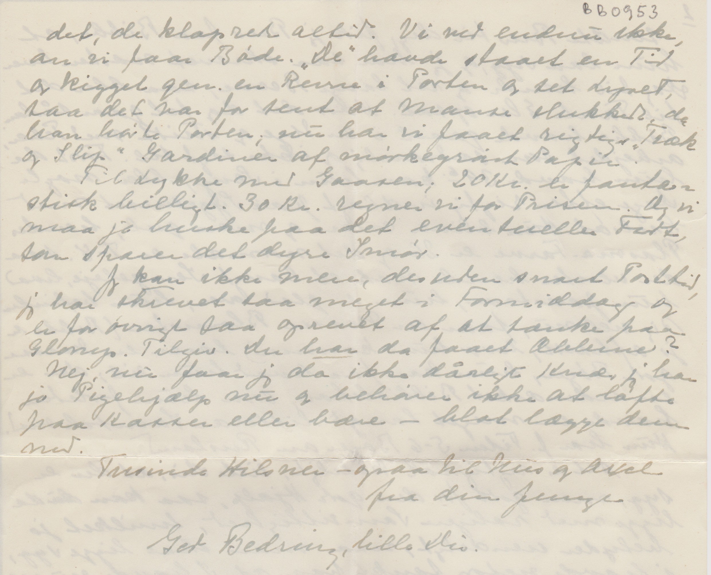 Jeg har nok slet ikke faaet dig sagt Tak, for dit lange Brev; du skrev ikke, om du var kommen af med Feberen – forhaab. er du det nu. - - Vi har forsøgt en Gang med Sække for Vinduerne, men Blæsten ville ikke tillade det, de klaprede altid. Vi ved endnu ikke, om vi faar Bøde. ”De” havde staaet en Tid og kigget gen. en Revne i Porten og set Lyset. Saa det var for sent at Manse slukkede, da han hørte Porten; nu har vi faaet rigtige ”Træk og Slip” Gardiner af mørkegrønt Papir.