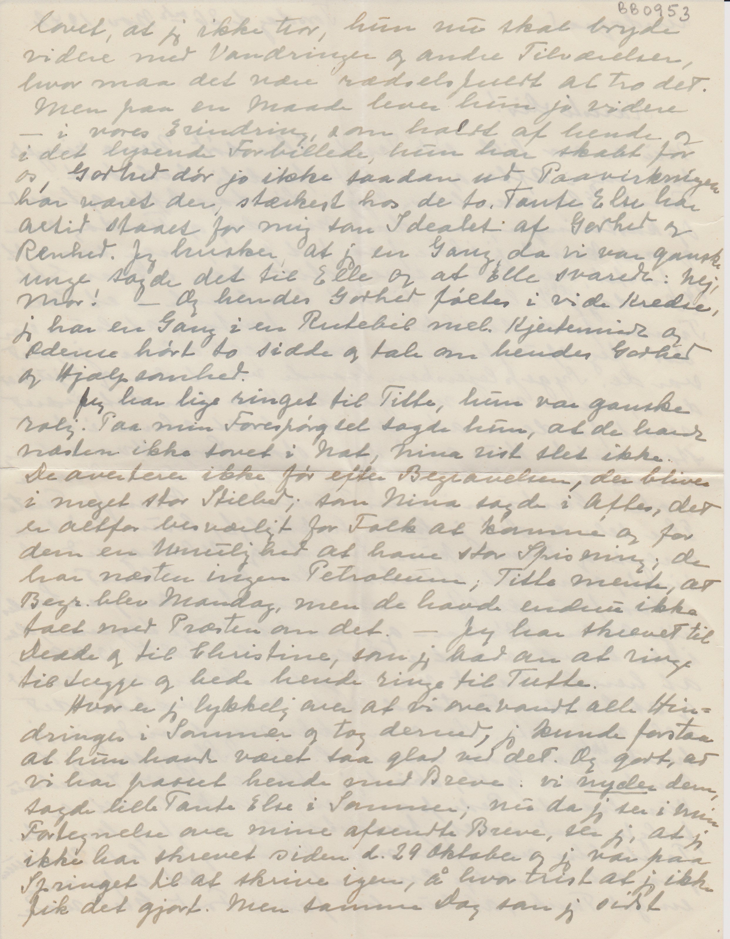 Hvor er jeg lykkelig over at vi overvandt alle Hindringer i Sommer og tog derned, jeg kunde forstaa at hun havde været saa glad ved det. Og godt, at vi har passet hende med Breve: vi nyder dem, sagde lille Tante Else i Sommer; nu da jeg ser i min Fortegnelse over mine afsendte Breve, ser jeg, at jeg ikke har skrevet siden d. 29 Oktober og jeg var paa Springet til at skrive igen, å hvor trist at jeg ikke fik det gjort. Men samme Dag som jeg sidst