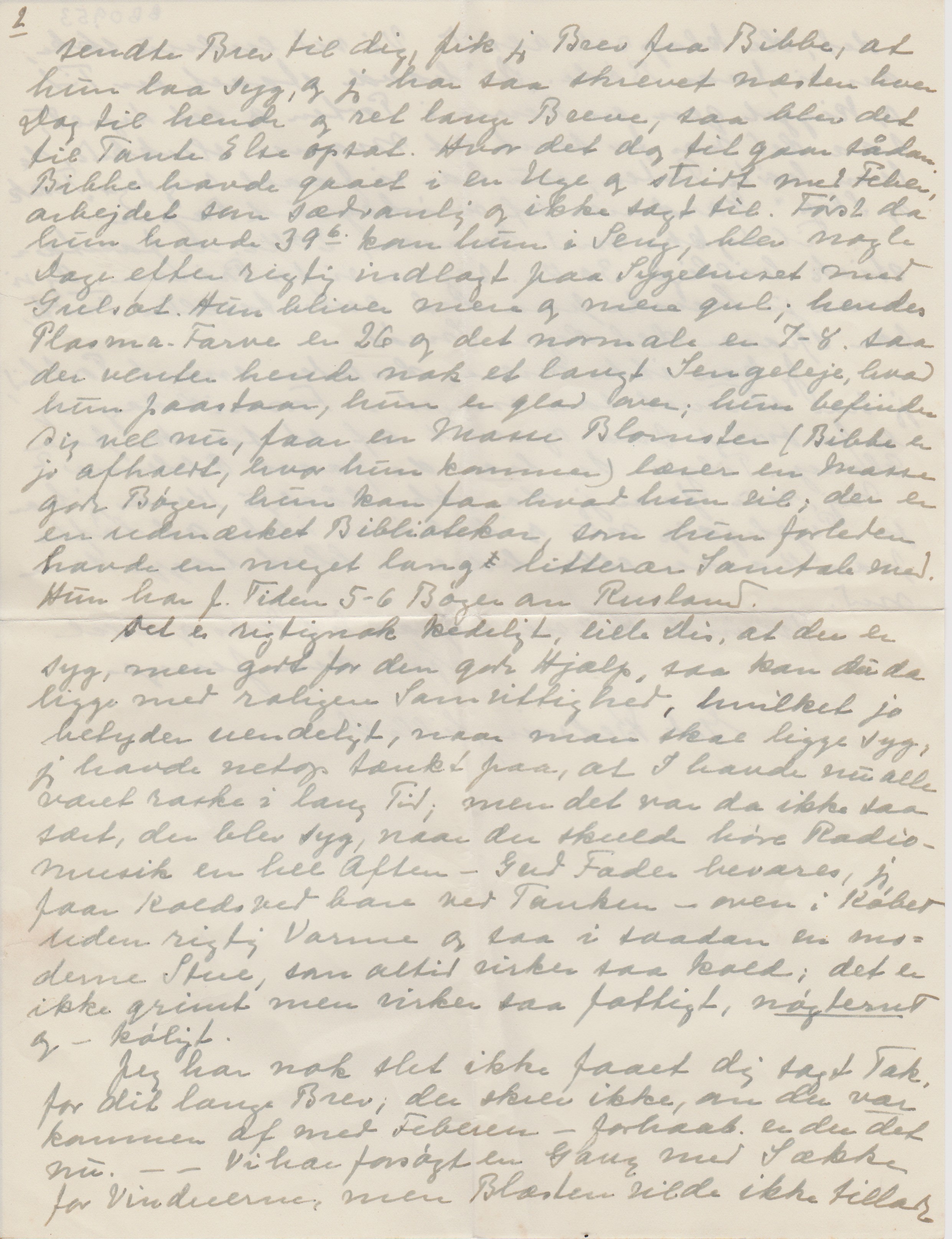 sendte Brev til dig, fik jeg Brev fra Bibbe, at hun laa syg, og jeg har saa skrevet næsten hver Dag til hende og ret lange Breve, saa blev det til Tante Else opsat. Hvor det dog tit gaar sådan. Bibbe havde gaaet i en Uge og stridt med Feber, arbejdet som sædvanlig og ikke sagt til. Først da hun havde 39.6 kom hun i Seng, blev nogle Dage efter rigtig indlagt paa Sygehuset med Gulsot. Hun bliver mere og mere gul; hendes Plasma-Farve er 26 og det normale er 7-8. saa der venter hende nok et langt Sengeleje, hvad hun paastaar, hun er glad over; hun befinder sig vel nu, faar en Masse Blomster (Bibbe er jo afholdt, hvor hun kommer) læser en Masse gode Bøger, hun kan faa hvad hun vil; der er en udmærket Bibliotekar, som hun forleden havde en meget langt litterær Samtale med. Hun har f. Tiden 5-6 Bøger om Rusland.