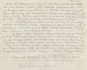 Jeg kan ikke mere, desuden snart Posttid, jeg har skrevet saa meget i Formiddag og er for øvrigt saa oprevet af at tænke paa Glorup. Tilgiv. Du har da faaet Æblerne? Nej, nu faar jeg da ikke dårligt Knæ jeg har jo Pigehjælp nu og behøver ikke at løfte paa Kasser eller bære – blot lægge dem ned.