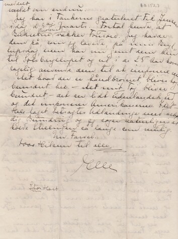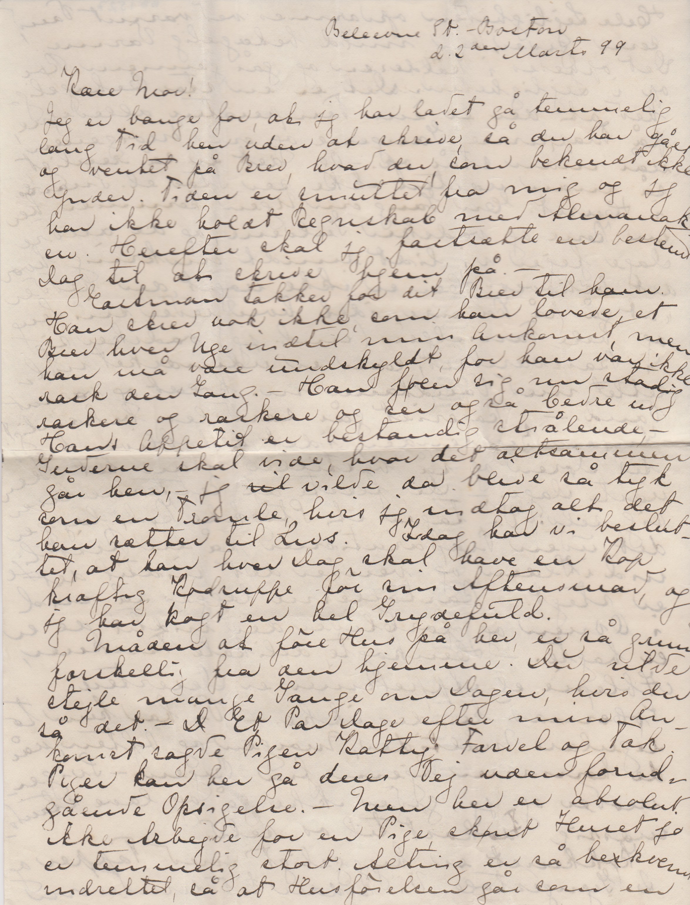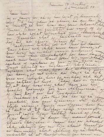 Eastman takker for dit Brev til ham. Han skrev nok ikke, som han lovede, et Brev hver Uge indtil min Ankomst, men han må være undskyldt, for han var ikke rask den Gang. – Han føler sig nu stadig raskere og raskere og ser også bedre ud. Hans Appetit er bestandig strålende, - Guderne skal vide, hvor det alt sammen går hen, - jeg vil ["vil" overstreget] vilde da blive så tyk som en Tromle, hvis jeg indtog alt det, han sætter til Livs. Idag har vi besluttet, at han hver Dag skal have en Kop kraftig Kødsuppe før sin Aftensmad, og jeg har kogt en hel Grydefuld.