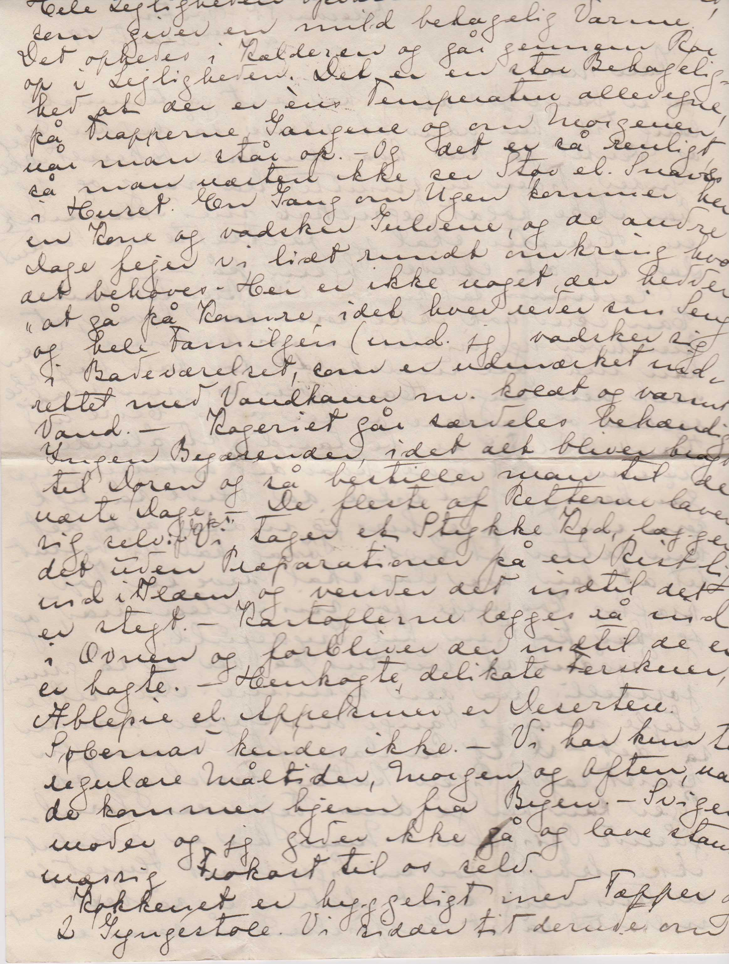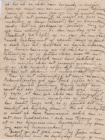 Måden at føre Hus på her, er så grumforskellig fra den hjemme. Du vilde stejle mange Gange om Dagen, hvis du så det. – D ["D" overstreget] Et Par Dage efter min Ankomst sagde Pigen Katty Farvel og Tak. Piger kan her gå deres Vej uden forudgående Opsigelse. – Men her er absolut ikke Arbejde for en Pige, skønt Huset jo er temmelig stort. Alting er så bekvemt indrettet, så alt Husførelsen går som en Hele Huset opvarmes ved varmt Vand, som giver en mild behagelig Varme. Det opvarmes i Kælderen og går gennem Rør op i Lejligheden. Det er en stor Behagelighed at der er èns Temperatur allevegne, på Trapperne, Gangene og om Morgenen, når man står op. – Og det er så renligt, så man næsten ikke ser Støv el. Snavs i Huset. En Gang om Ugen kommer her en Kone og vadsker Gulvene, og de andre Dage fejer vi lidt rundt omkring, hvor det behøves – her er ikke noget, der hedder ”at gå på Kamre, idet hver reder sin Seng og hele Familjen (und. jeg) vadsker sig i Badeværelset, som er udmærket indrettet med Vandhaner m. koldt og varmt Vand. - Kogeriet går særdeles behændigt. Ingen Byærender, idet alt bliver bragt til Døren og så bestiller man til de næste Dage. - De fleste af Retterne laver sig selv f. Eks. ["f. Eks." indsat over linjen] Vi tager et Stykke Kød, lægger det uden Præparationer på en Rist lige ind i Ilden og vender det, indtil det er stegt. – Kartoflerne lægges så ind i Ovnen og forbliver der, indtil de er bagte. – Henkogte delikate Ferskener, Æblepie el. Appelsiner er Desserten. Søbemad kendes ikke. – Vi har kun to regulære Måltider, Morgen og Aften, når de kommer hjem fra Byen. – Svigermoder og jeg gider ikke gå og lave standsmæssig Frokost til os selv.