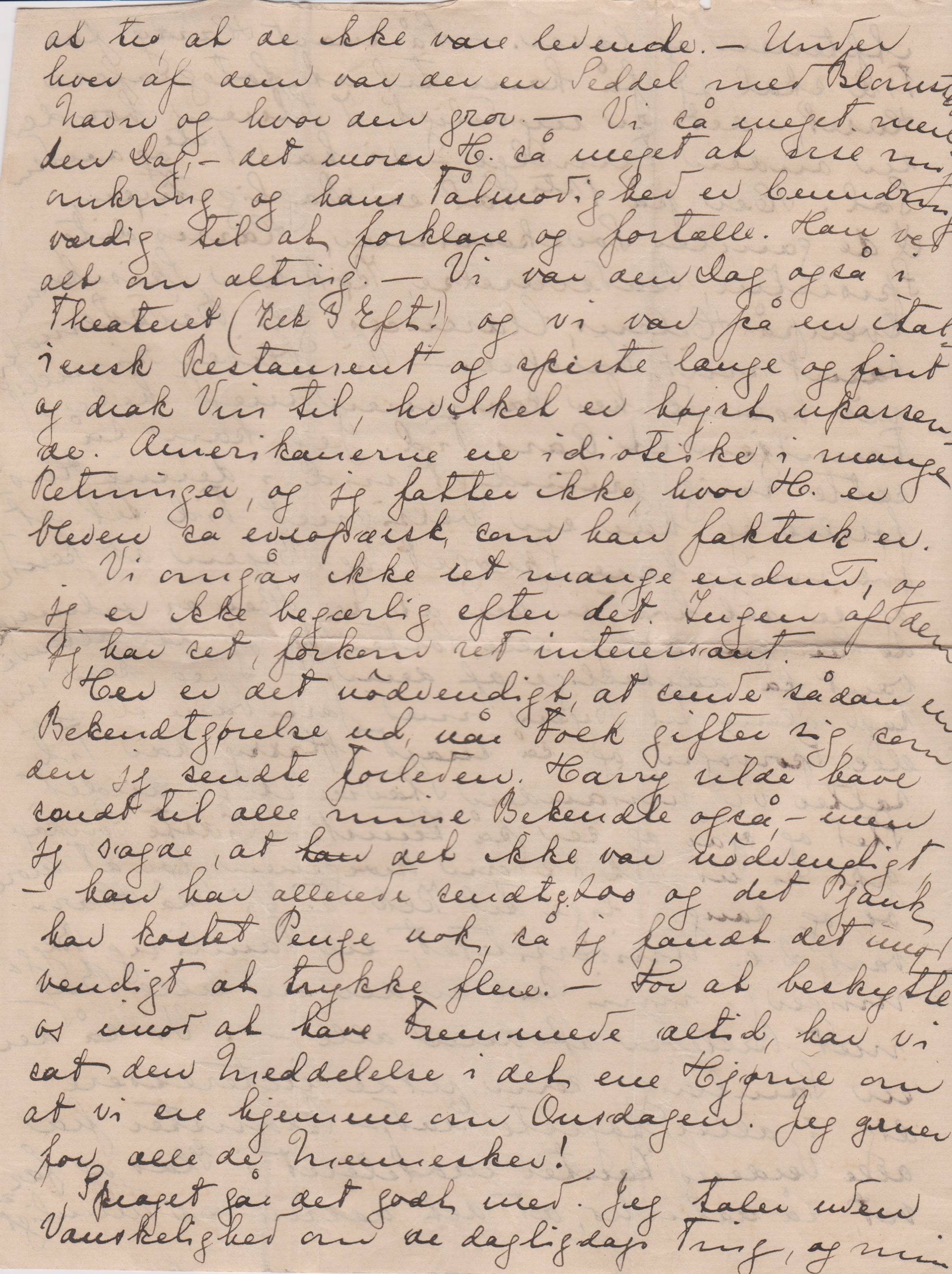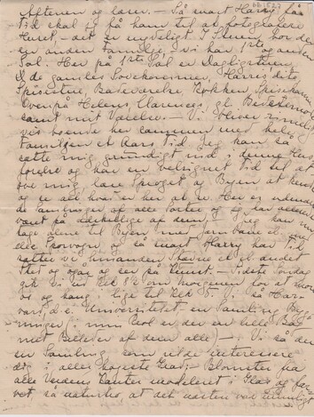 Så snart det er muligt, vilde jeg gærne have sendt min store Kasse med alt mit Habengut. Gl. Eastman har en Ven som er Toldofficer, og han har lovet at tage sig af det. Når det bliver sendt som ”left Bagage” direkte hertil, vil vi rimeligvis ikke komme til at betale Told. – Jeg vil skrive om et Par Dage igen og sende en Liste over, hvad jeg gærne vil have sendt.