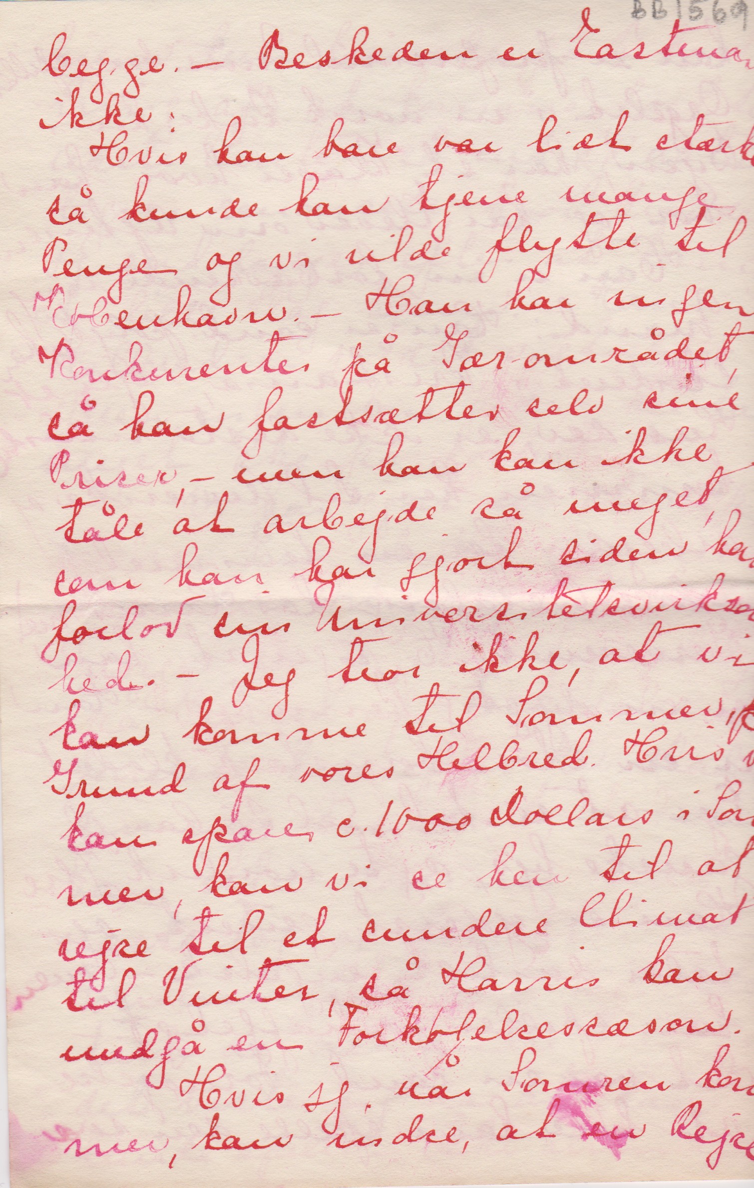 Hvis jeg, når Sommeren kommer, kan indse, at en Rejse hjem kun kan ske på Bekostning af at komme bort til næste Vinter, så må jeg vi ["jeg" overstreget; ”vi” indsat over linjen] renoncere, hvor brændende jeg end længes efter at komme et lille Slag hjem. – Hans Helbred er jo det vigtigste. Men ingen kan vide, - her kan meget ske på kort Tid. –